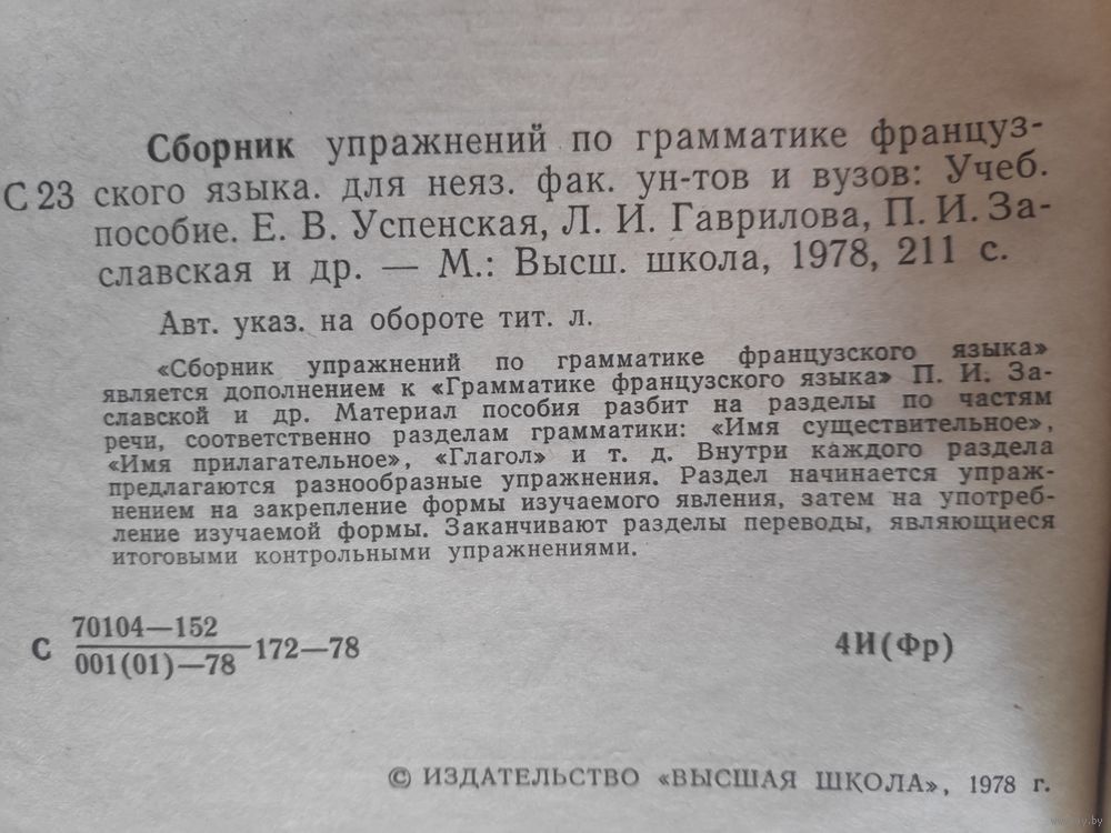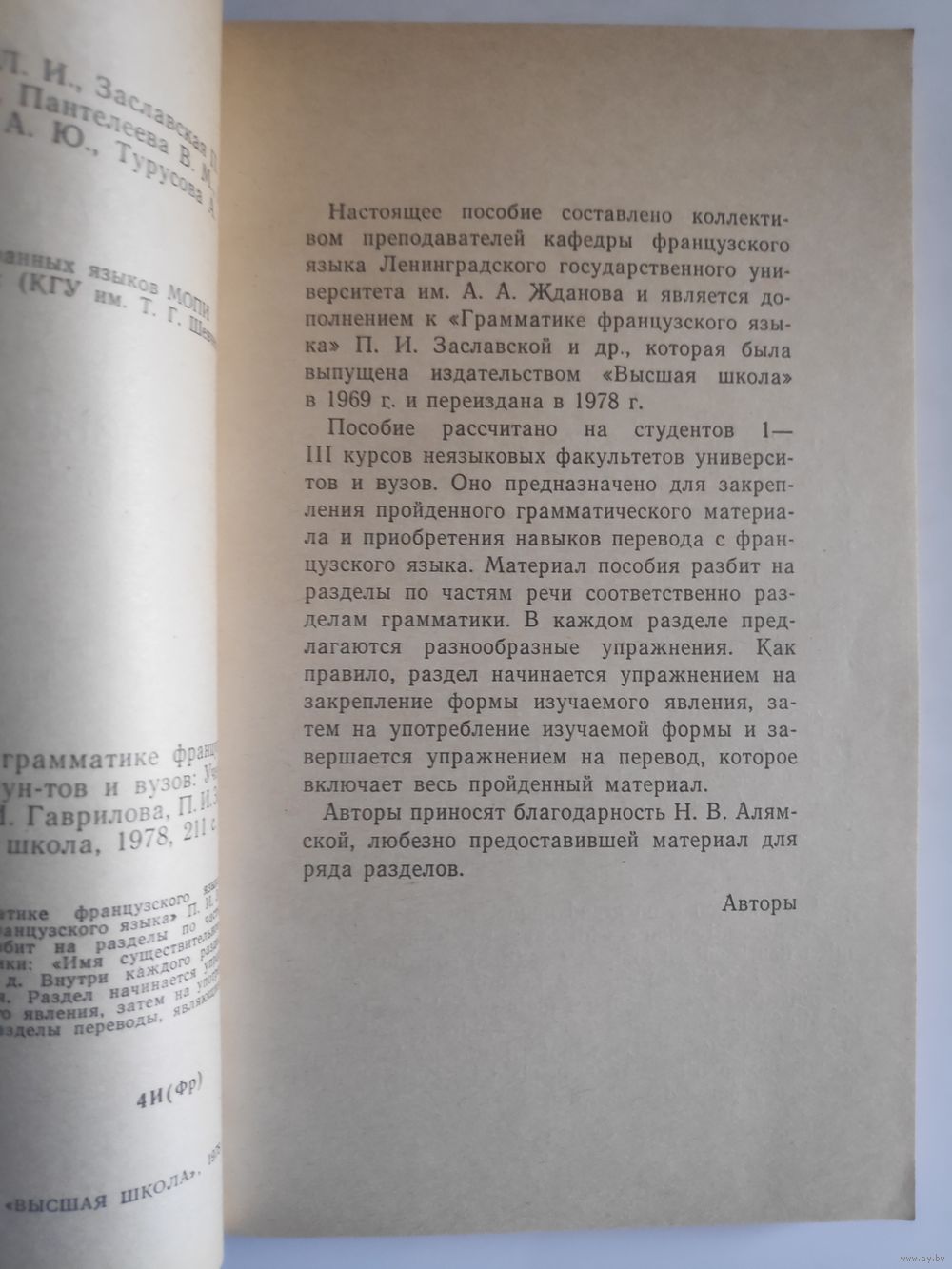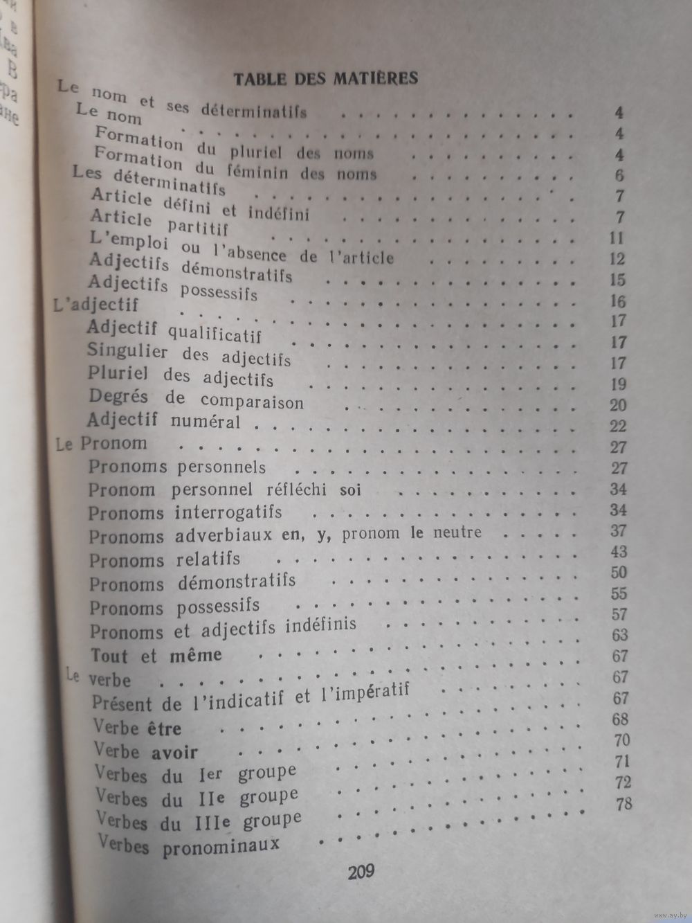 «Сборник упражнений по грамматике французского языка» является дополнением к «Грамматике французского языка» П. И. Заславской и др. Материал пособия разбит на разделы по частям речи, соответственно разделам грамматики: «Имя существительное», «Имя прилагательное», «Глагол» и т. д. Внутри каждого раздела предлагаются разнообразные упражнения. Раздел начинается упражнением на закрепление формы изучаемого явления, затем на употребление изучаемой формы. Заканчивают разделы переводы, являющиеся итоговыми контрольными упражнениями.