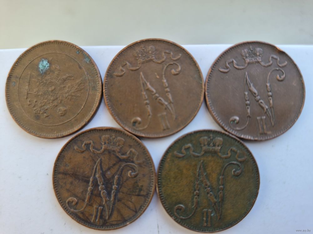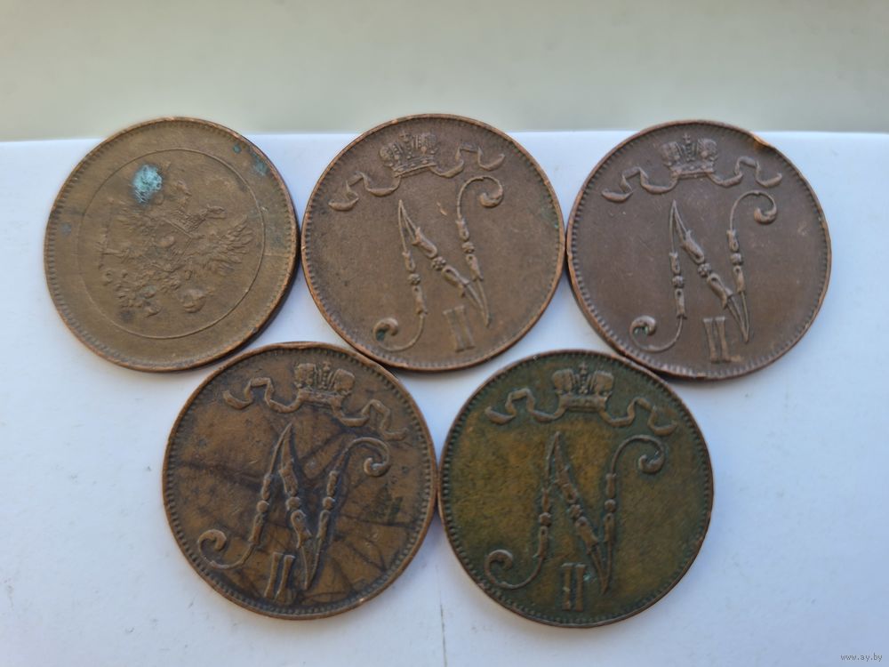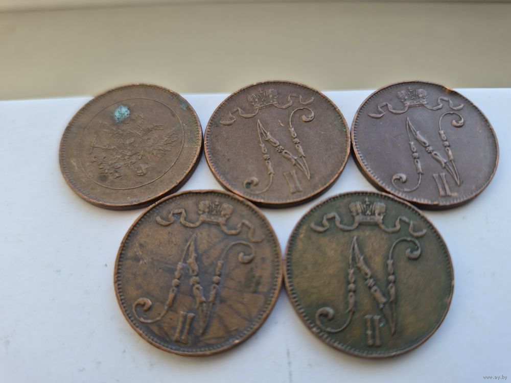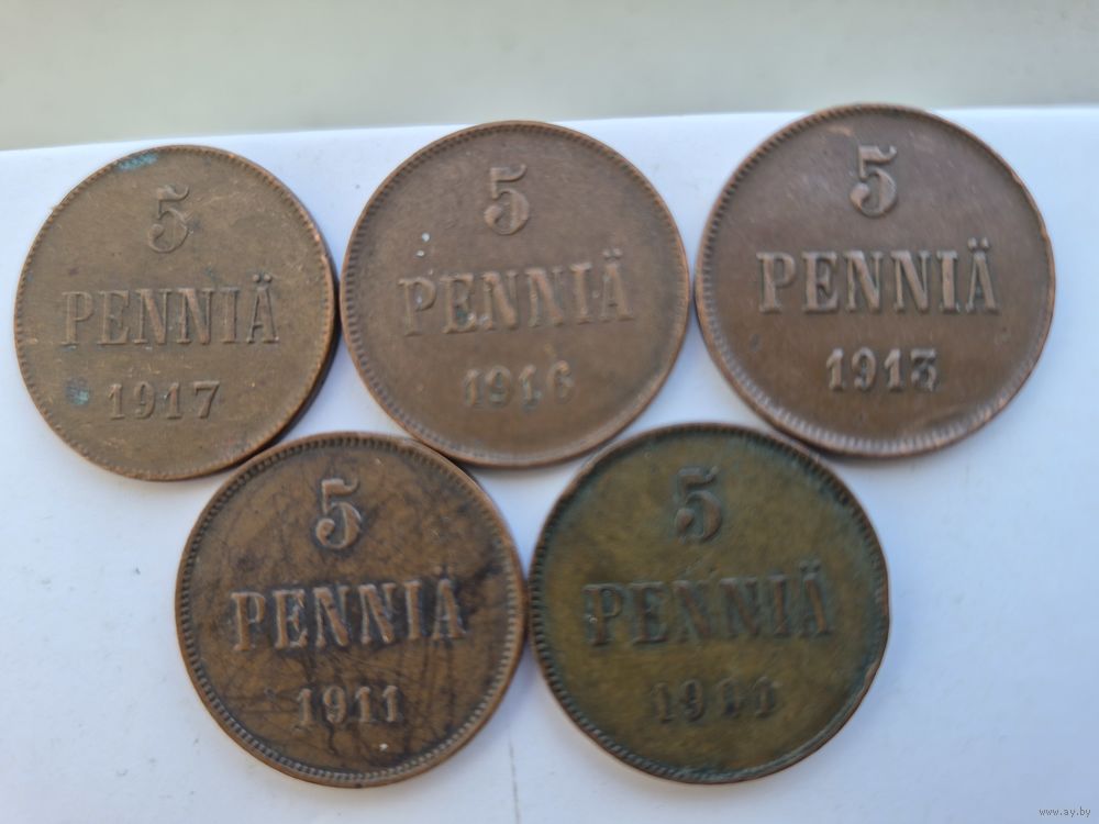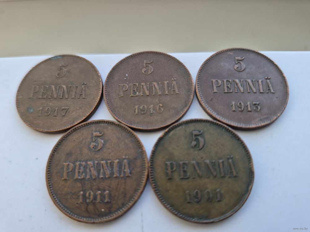 Сборный лот 5 пенни 1901, 1911, 1913, 1916, 1917 годов, для Финляндии (Николай II). Лот состоит из 5-ти монет. Монеты не чищены. 45661.