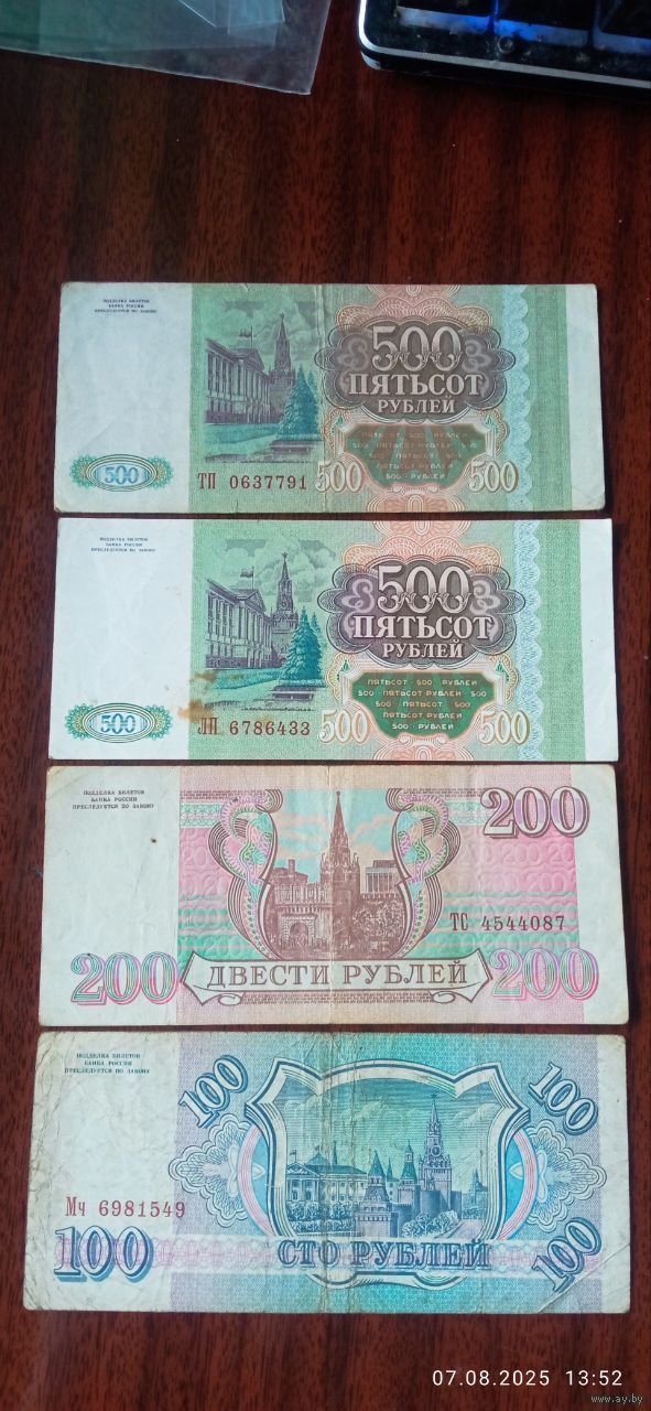 Сборный лот 500,500,200 и 100 рублей 1993 год Россия (Состояние на фото)