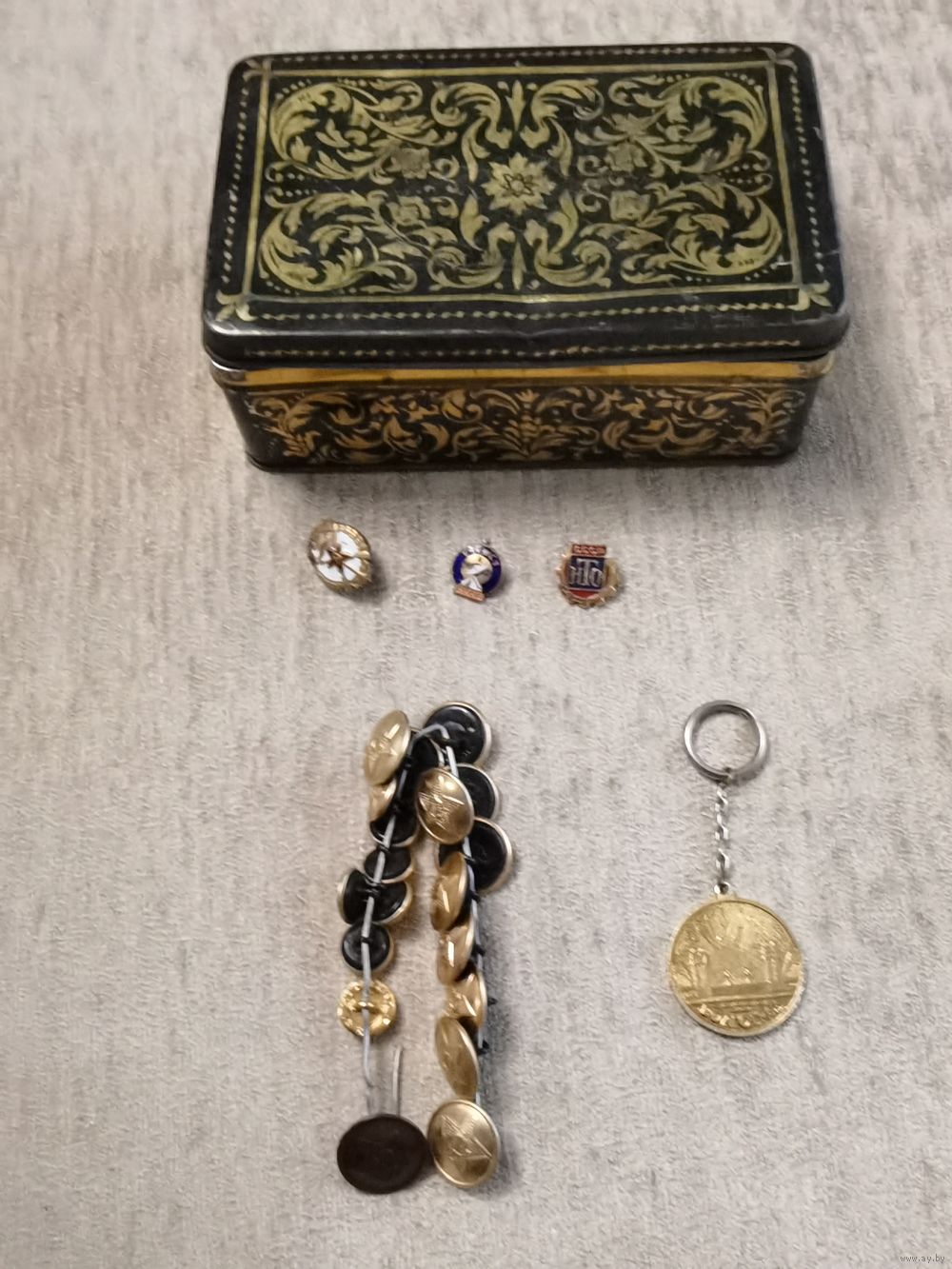 Значки, пуговицы, брелок, металлическая коробка из ссср, одним лотом