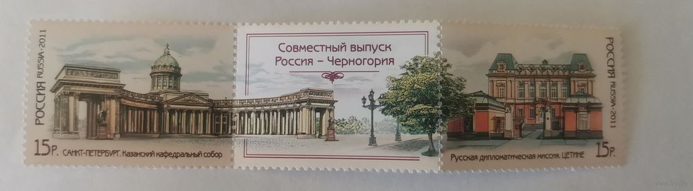 На марках изображены Казанский кафедральный собор в Санкт-Петербурге и здание Русской дипломатической миссии в Цетине.