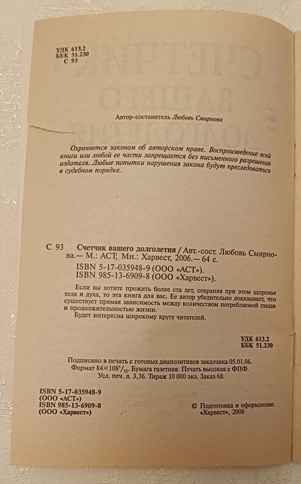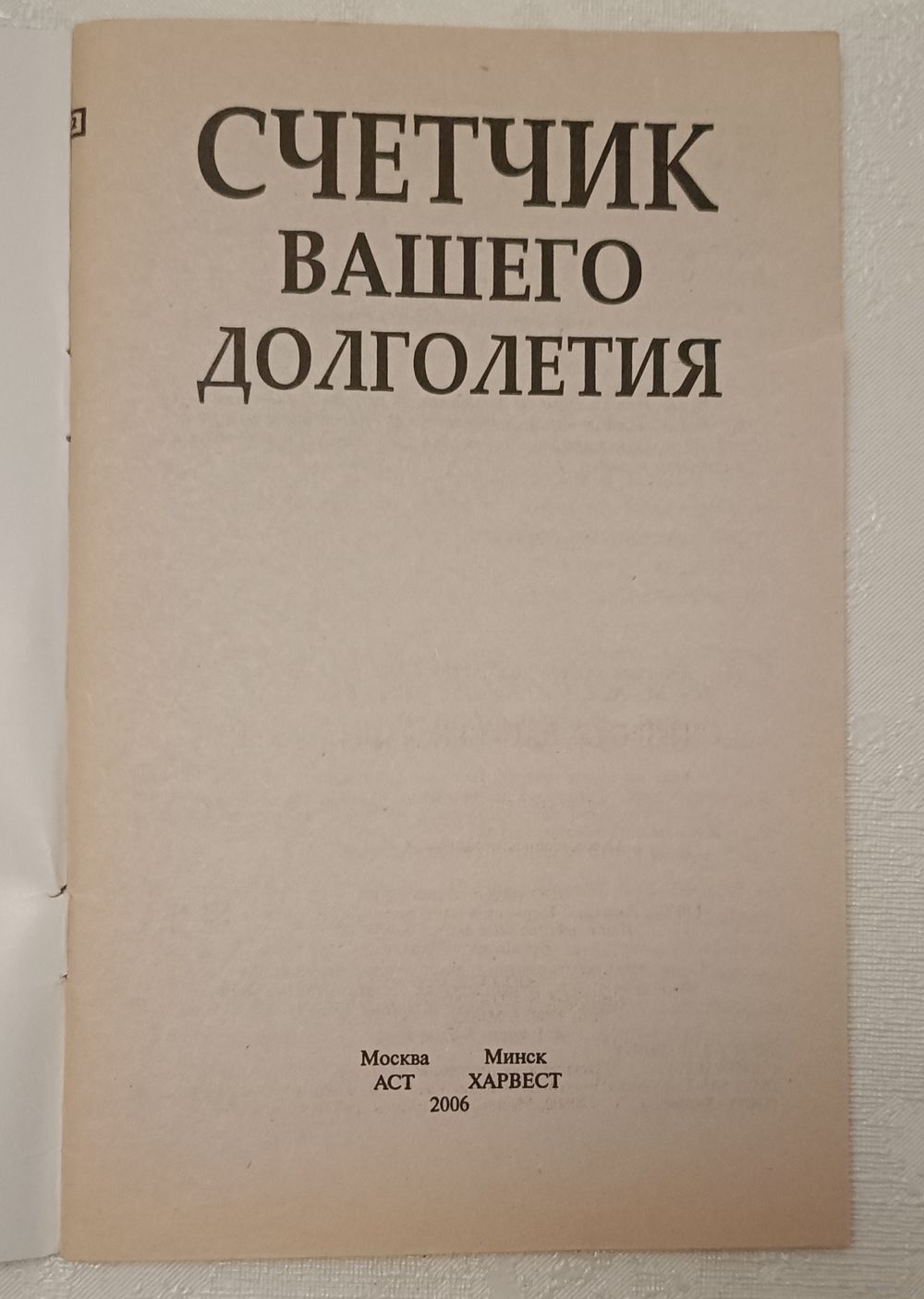 Счетчик вашего долголетия. Авт.-сост. Любовь Смирнова. - М.: АСТ; Мн.: Харвест, 2006. — 64 с., мягкая обложка.