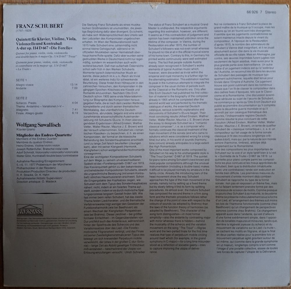 Schubert, Wolfgang Sawallisch, Endres-Quartett – Forellen-Quintett (Quintet In A Op. 114 Trout / Quintette En La Majeur Op. 114 La Truite)
