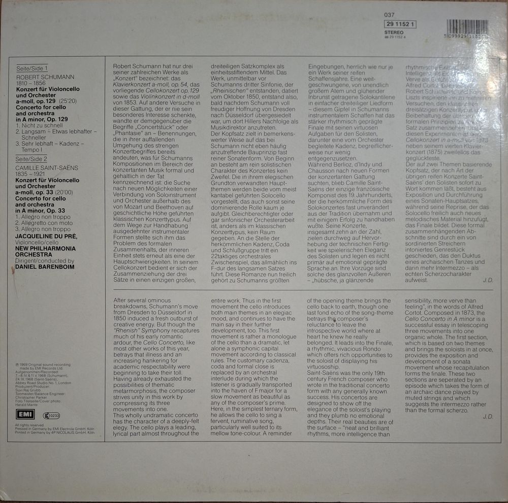 Schumann, Saint-Saens - Jacqueline Du Pre, Daniel Barenboim Conducting The New Philharmonia Orchestra – Cello Concerto In A Minor / Cello Concerto No. 1 In A Minor