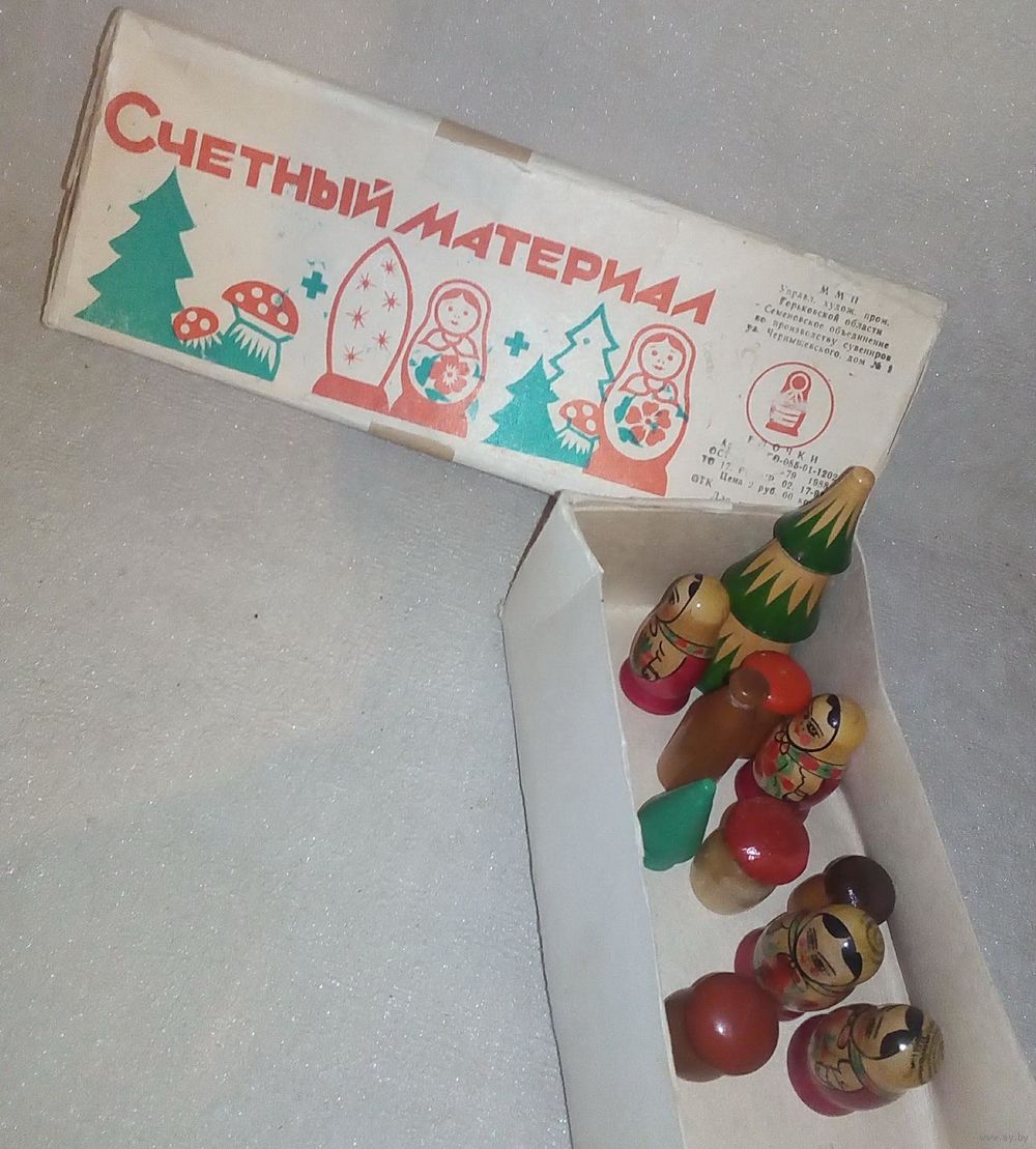Счётный материал СССР коробка и некомплект набора - деревянные ёлочки, грибочки, матрёшки