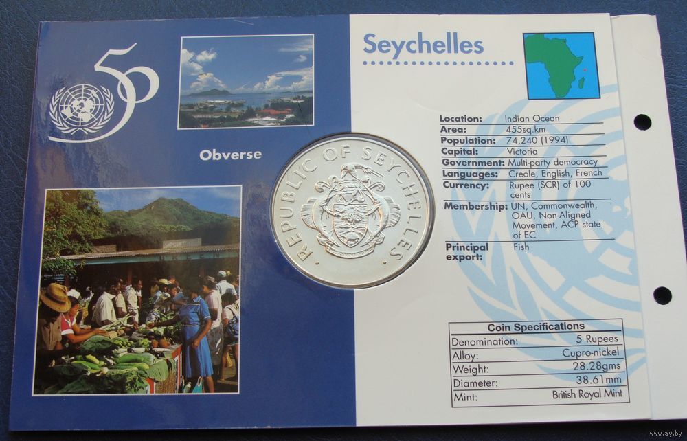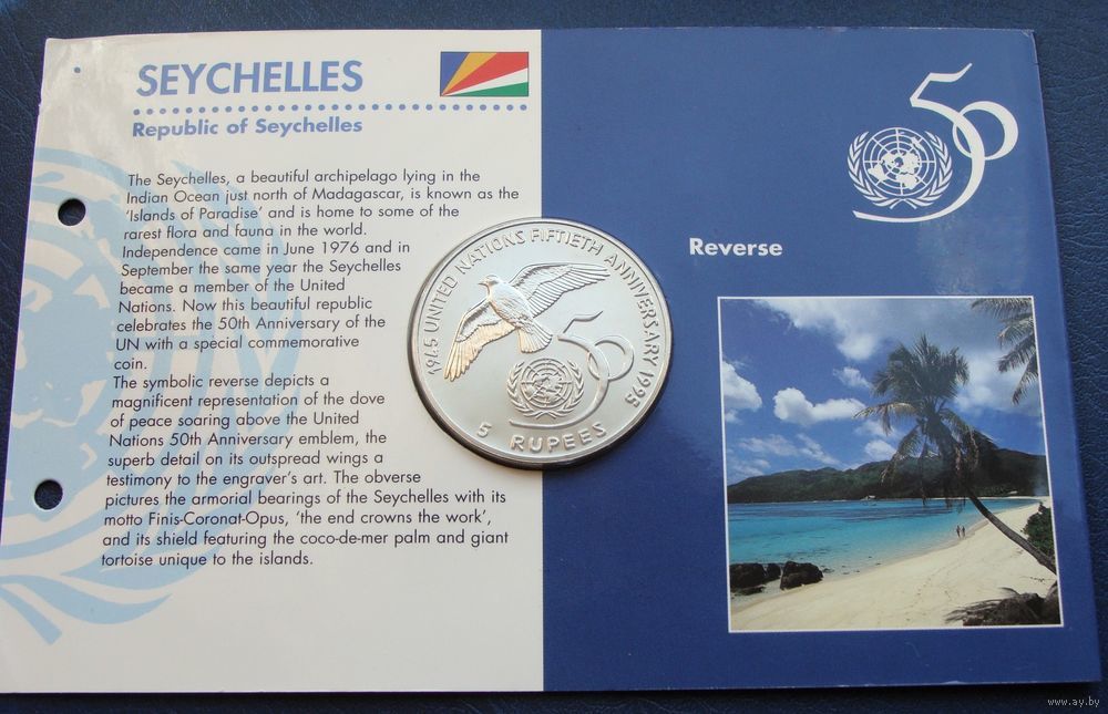 ///////// Доброго времени суток, спасибо, что заглянули в мой лоток!!! ////////// Данный лот выставлен на продажу как предмет коллекционирования и не является пропагандой чего бы то ни было, а также не является валютной сделкой!!!! Важно - Участникам торгов с отрицательным, нулевым или низким рейтингом просьба подтвердить намерения покупки лота по телефону или в обсуждениях лота. Лицам ранее не выкупившим у меня лоты, просьба ставки не делать, иначе они будут удалены. К Участию в торгах не допускаются лица не прошедшие верификацию на сайте. Продавец, сохраняет за собой право, снять ставку участника или отказать в продаже лота, если у продавца имеются подозрения в недобросовестности покупателя или отрицательные отзывы. ////////// Отправка обычным письмом, конвертом 1-ого класса, мелким пакетом (посылкой, бандеролью) с наложенным платежом и предоплата "на телефон" не рассматривается!!! В случае невыхода на связь или немотивированного отказа от покупки лота(ов), буду вынужден поставить отрицательный отзыв и переставить лот(ы). ////////// Информация: WWC номер KM # 89 Страна: Сейшелы Период: Республика Сейшельские Острова (1976 - 2024) Валюта: Сейшельская рупия Вид чекана: Юбилейные монеты Номинал: 5 рупий Год: 1995 Наименование: 50 лет ООН Материал: Медно-никелевый сплав Гурт: Гладкий Форма: Круг Отношение авс/рев: Медальное (0°) Вес (g) 27.85 Диаметр (mm) 38.7 Толщина (mm) 3.2 //////// Состояние монеты на фото //////// Описание: Моя оценка состояния может не совпадать с вашей. Внимательно изучите фотографию!!!