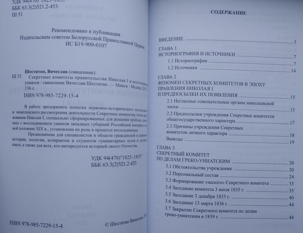 Большой энциклопедический формат. Тираж 1000 экз. 138 стр. Участие Секретных комитетов правительства императора Николая I в подготовке и совершении воссоединения униатов с православными на территории Российской империи в 1839 г. до сих пор остается исследованной недостаточно. В исторической литературе, посвященной воссоединению, Секретные комитеты постоянно упоминаются, однако специальных работ, в которых рассматривается цель их учреждения, персональный состав, ход заседаний и проч. до сих пор не существует. Между тем, эта тема представляется важной для усвоения исторической значимости упразднения Брестской церковной унии на Полоцком Соборе 1839 г., поскольку, только рассмотрев деятельность Секретных комитетов и обозначив ее результаты, можно определить степень влияния правительственных структур Российской империи на упразднение униатской церкви в ее границах и дать ей оценку. До настоящего времени в многочисленных исследованиях, посвященных упразднению церковной унии в России в 1839 г., авторы пишут о существовании одного Секретного комитета по униатским делам, который существовал с 1835 г. и работал с перерывами до 1839 г. включительно. К особой заслуге автора нужно отнести то, что он на основании документов аргументировано продемонстрировал ошибочность такого мнения. На самом деле в процессе подготовки и осуществления упразднения унии действовали три Секретных комитета, которые различались по персональному составу, целям и задачам, поставленным перед ними. Наиболее значимый вывод автора монографии состоит в том, что «Секретные комитеты не являлись разработчиками и проводниками сколь-нибудь отчетливой и долговременной политики в отношении униатской церкви в Российской империи, лишь фрагментарно и эпизодически участвуя в деле воссоединения».