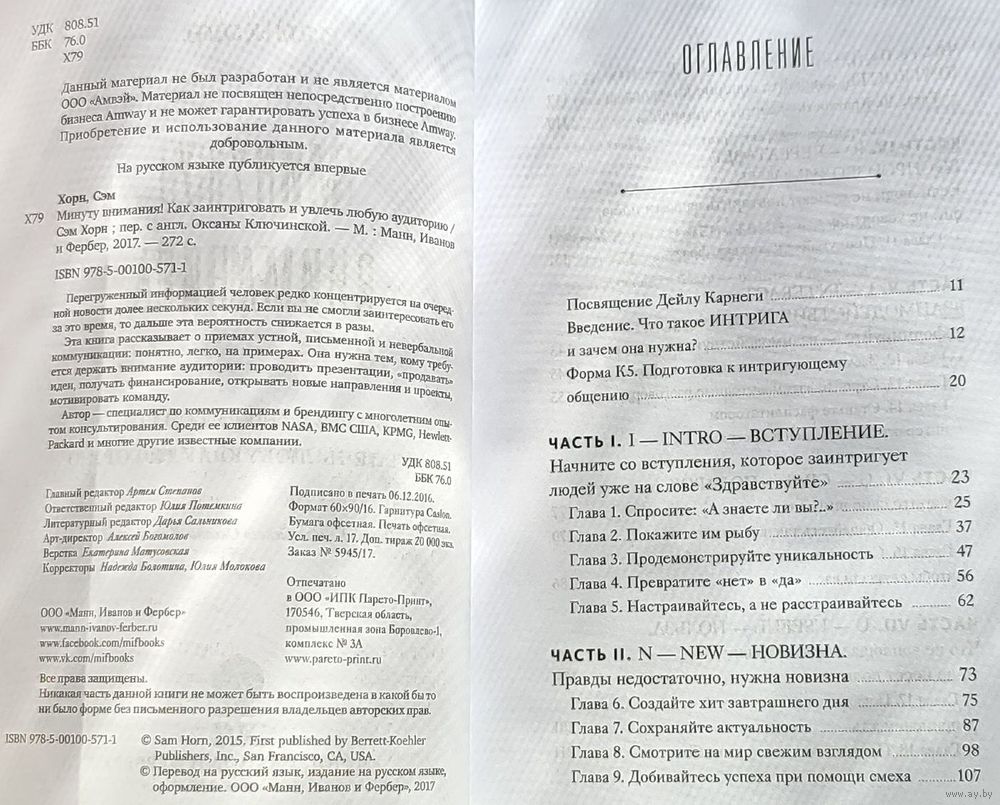 Перегруженный информацией человек редко концентрируется на очередной новости долее нескольких секунд. Если вы не смогли заинтересовать его за это время, то дальше эта вероятность снижается в разы. Эта книга рассказывает о приемах устной, письменной и невербальной коммуникации: понятно, легко, на примерах. Она нужна тем, кому требуется держать внимание аудитории: проводить презентации, «продавать» идеи, получать финансирование, открывать новые направления и проекты, мотивировать команду. Автор – специалист по коммуникациям и брендингу с многолетним опытом консультирования. Среди ее клиентов NASA, ВМС США, KPMG, Hewlett-Packard и многие другие известные компании