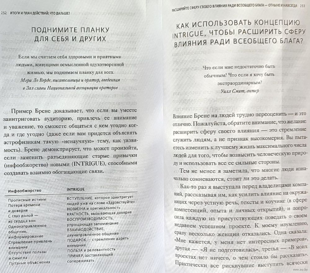 В своей книге она рассказывает о приемах устной и письменной коммуникации, раскрывает темы поз, мимики, жестов и иллюстрирует все техники примерами. Благодаря им вы сможете интриговать своих слушателей и удерживать их внимание