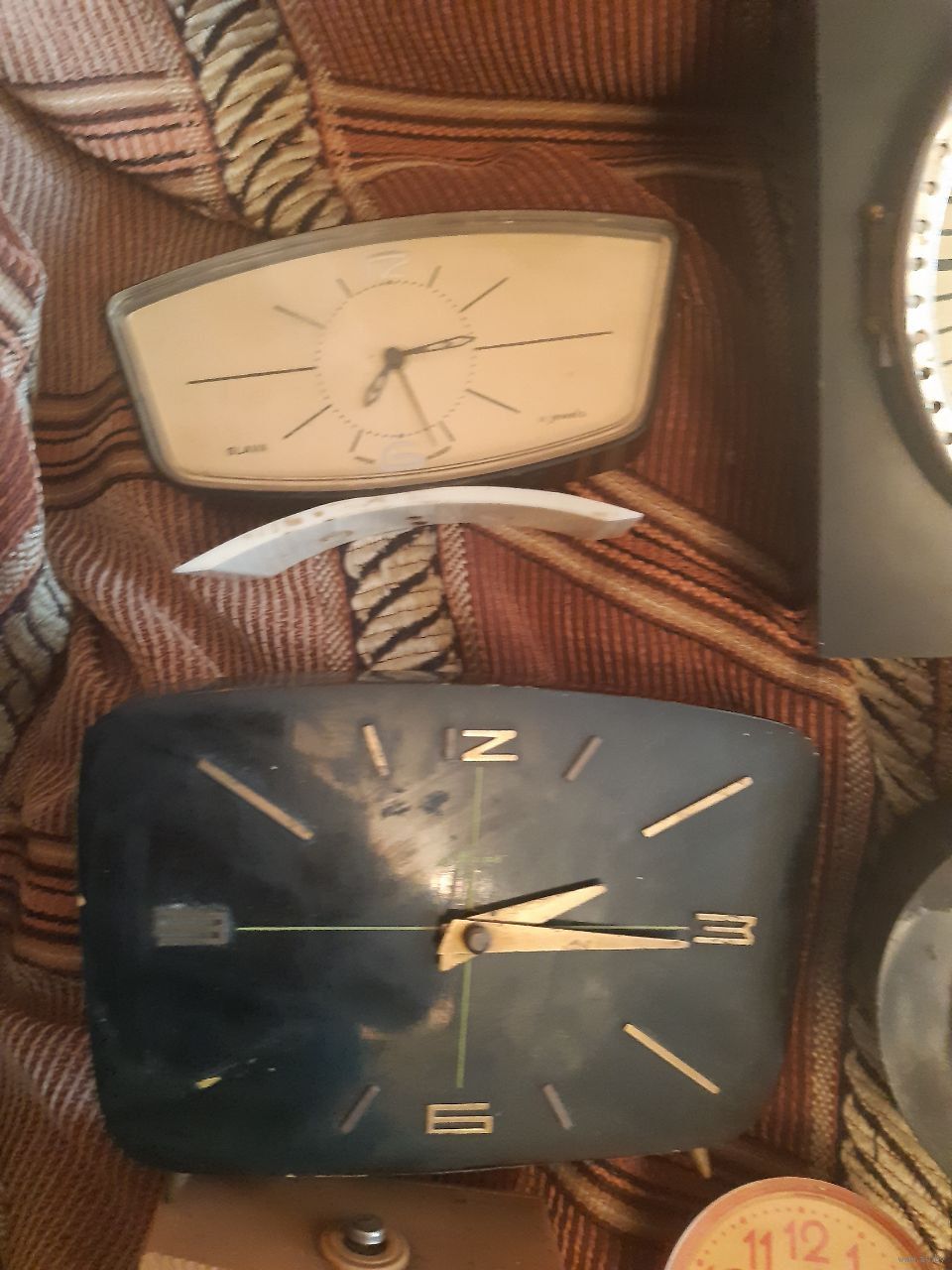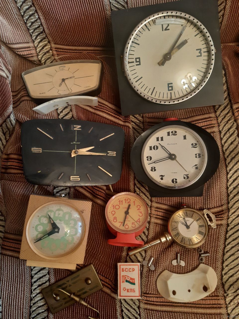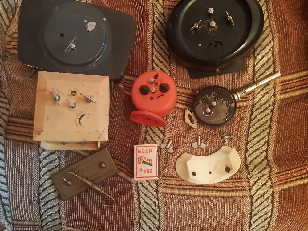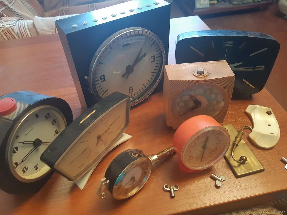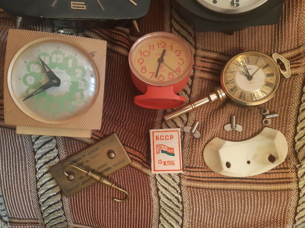 Описание: Состояние по фото. В ремонт, на восстановление, на запчасти. Продаются как нерабочие. Часы периода СССР в пластиковых, деревянных, металлических корпусах. Бонусом ключики и ручка.