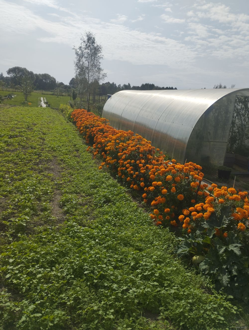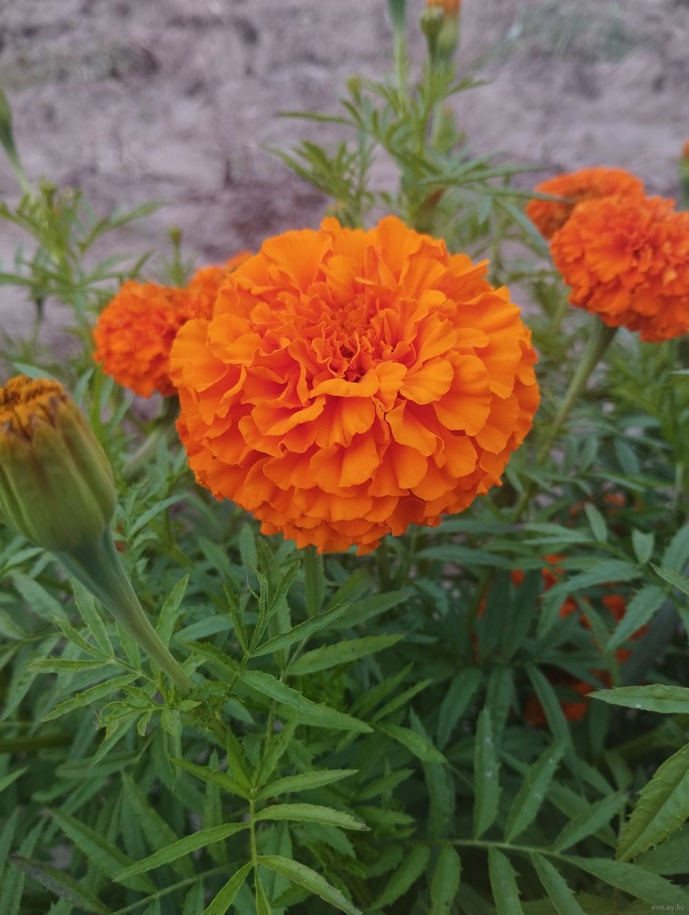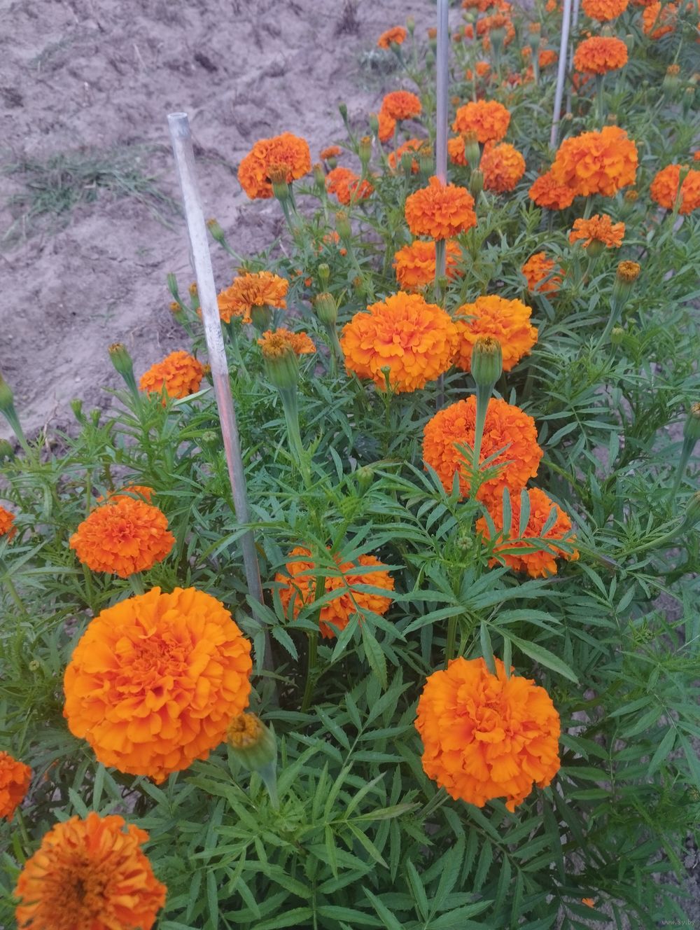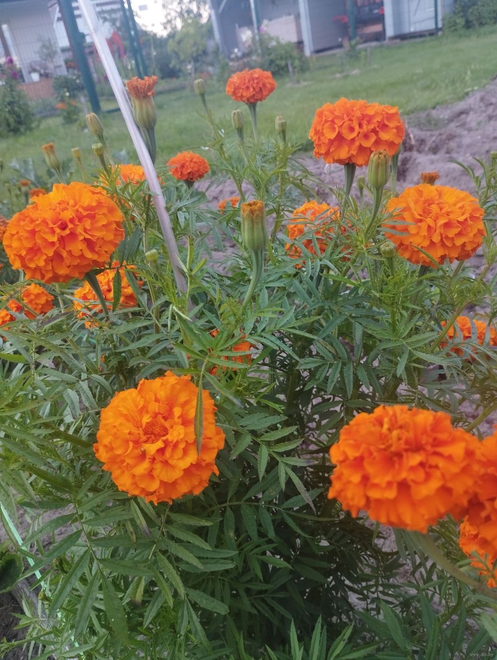 Семена бархатцев оранжевого цвета. Урожай 25 года. Высота куста 45 см. Стоимость одной столовой ложки 80 копеек. Цветок имеет вид помпона.