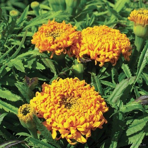 . Бархатцы Хризантема голд. Оригинальный сорт бархатцев с крупными хризантемовидными соцветиями. Кусты прочные, сильноветвистые, высотой 35-45 см, устойчивые к непогоде, с большим количеством цветоносов. Соцветия 7-8 см , махровые, плотные, в изобилии появляются с начала лета и до первых заморозков. 1 чайная ложка - 1 р