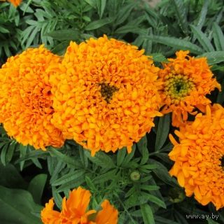 Бархатцы Оранжевый снег. Новый компактный сорт с невероятным количеством крупных соцветий, похожих на осенние хризантемы с закрученными лепестками. Цветут обильно и продолжительно. 1ч ложка - 1 р.