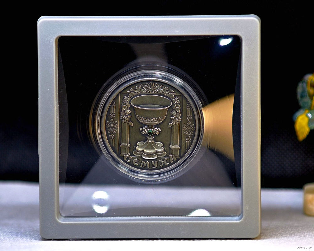 в центре в обрамлении колонн – рельефное изображение символов праздника "Сёмуха" – чаши и венка из листьев березы, клена, рябины, аира (на серебряной монете в украшении чаши имеется вставка из синтетического кристалла зеленого цвета); слева и справа – рельефные элементы белорусского национального орнамента; внизу – надпись по кругу "СЁМУХА".