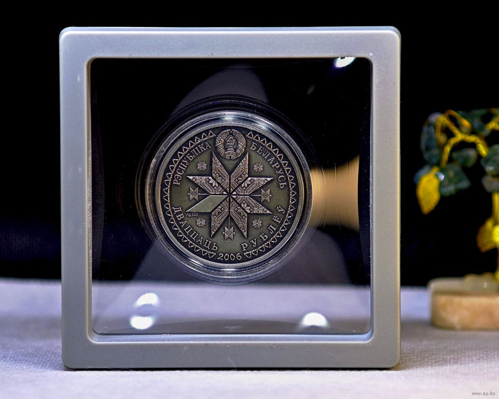 в круге, обрамленном геометрическим орнаментом, – рельефное изображение Государственного герба Республики Беларусь; в центре – солярный знак, состоящий из восьмиконечной геометрической фигуры с элементами ромбического декора, символизирующий солнечные лучи; под ним указаны: год чеканки, для серебряной – проба сплава; по кругу надписи: в верхней части – "РЭСПУБЛIКА БЕЛАРУСЬ", в нижней – "ДВАЦЦАЦЬ РУБЛЁЎ" (на серебряной) и "АДЗIН РУБЕЛЬ" (на медно–никелевой).