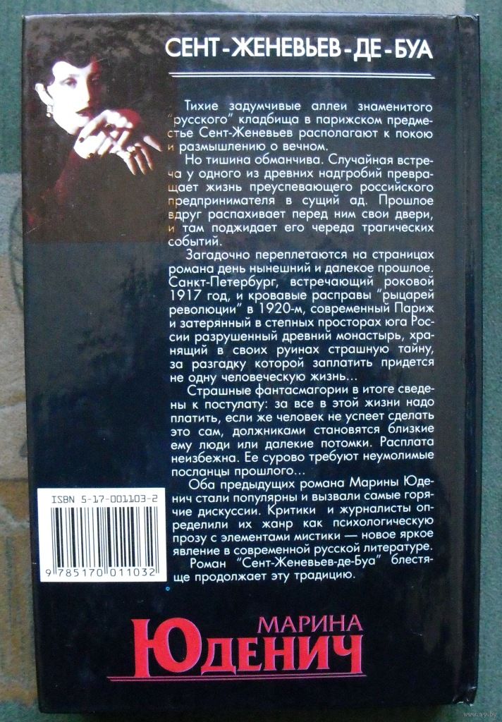 Сент — Женевьев — де — Буа. Тихие задумчивые аллеи знаменитого «русского» кладбища в парижском предместье Сент — Женевьев располагают к покою и размышлению о вечном. Но тишина обманчива. Случайная встреча у одного из древних надгробий превращает жизнь преуспевающего российского предпринимателя в сущий ад. Прошлое вдруг распахивает перед ним свои двери, и там поджидает его череда трагических событий. Загадочно переплетаются на страницах романа день нынешний и далекое прошлое. Санкт — Петербург, встречающийроковой 1917 год, и кровавые расправы «рыцарей революции» в 1920 — м, современный Париж и затерянный в степных просторах юга России разрушенный древний монастырь, хранящий в своих руинах страшную тайну, за разгадку которой заплатить придется не одну человеческую жизнь… Страшные фантасмагории в итоге сведены к постулату: за все в этой жизни надо платить, если же человек не успевает сделать это сам, должником становятся близкие ему люди или далекие потомки. Расплата неизбежна. Ее сурово требуют неумолимыепосланцы прошлого… Оба предыдущих романа Марины Юденич стали популярны и вызвали самые горячие дискуссии. Критики и журналисты определили их жанр как психологическую прозу с элементами мистики — новое яркое явление в современной русской литературе. Роман«Сент — Женевьев — де Буа» блестяще продолжает эту традицию.