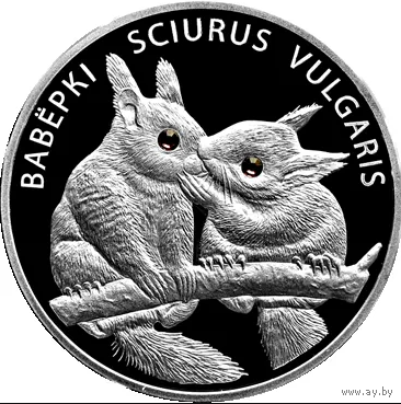 В центре — рельефное изображение 2 белок, в глазах — вставки из кристалла Сваровски; вверху по кругу надпись: ВАВЁРКI SCIURUS VULGARIS.