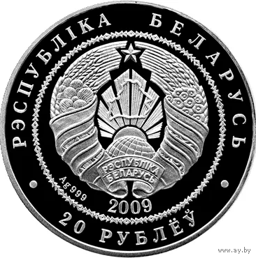 В центре в круге, обрамленном геометрическим орнаментом, — рельефное изображение Государственного герба Республики Беларусь; под ним — год чеканки, проба сплава; по кругу надписи: вверху — РЭСПУБЛIКА БЕЛАРУСЬ, внизу номинал — 20 РУБЛЁЎ.