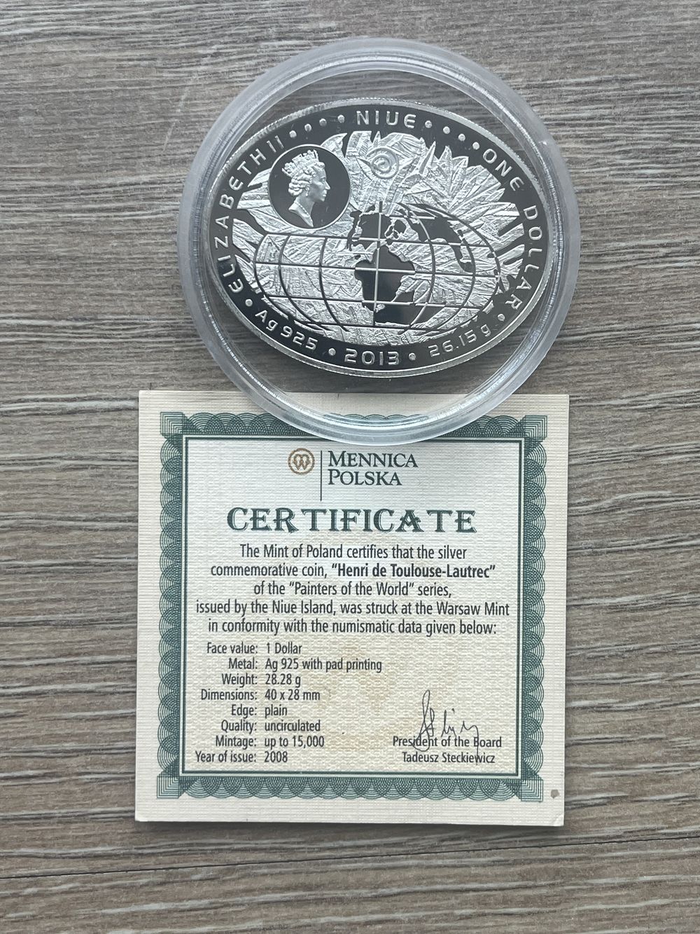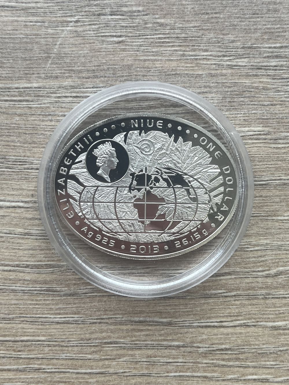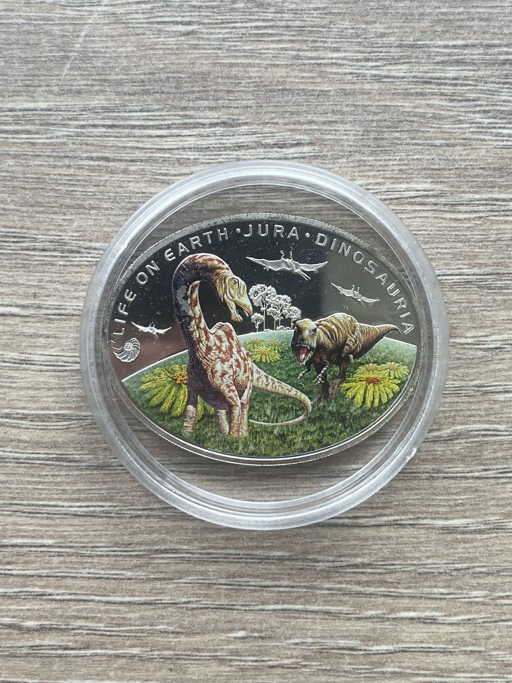 Эта серебряная коллекционная монета номиналом 1 доллар, выпущенная в 2013 году на острове Ниуэ, посвящена теме динозавров.