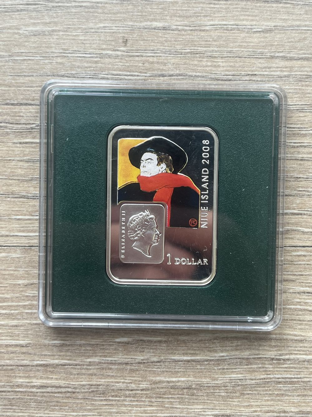 Это коллекционная прямоугольная серебряная монета номиналом 1 доллар, выпущенная Ниуэ в 2008 году.