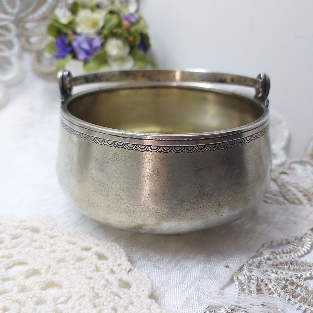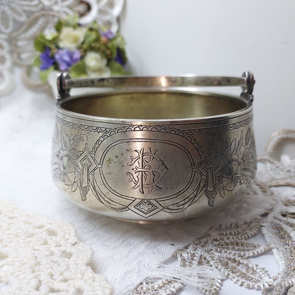 Сахарница или конфетница, изготовленная в Москве в 1887 году (период правления Александра 111) и украшенная штихельной резьбой (ручной гравировкой по металлу специальным инструментом) из серебра 84 пробы (соответствует современной 875 пробе).