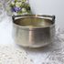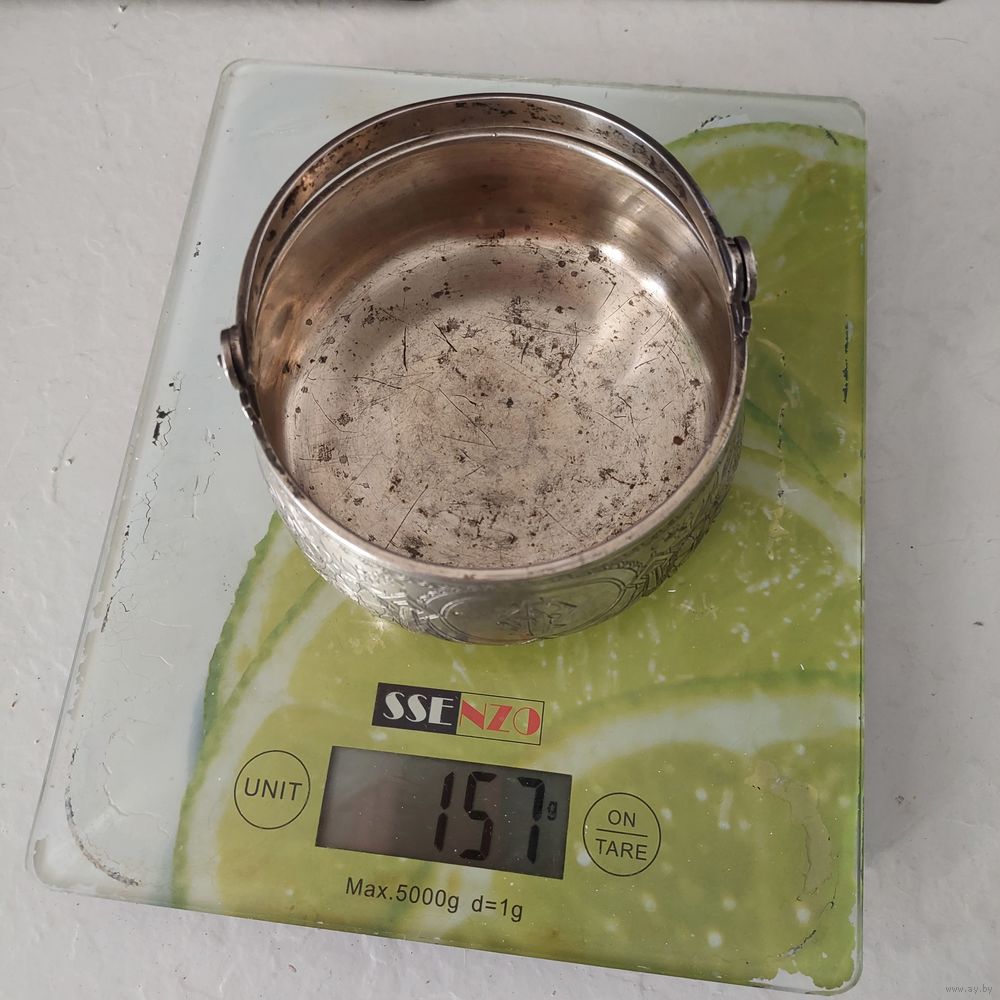 Изделие выполнено в форме ведерка с подвижной ручкой, что было очень популярным фасоном в 1880-х гг. На центральном картуше выгравирована сложная монограмма (вензель), которая, скорее всего, обозначает инициалы владельца. Также подобные предметы в то время дарили на свадьбу / венчание / помолвку. В этом случае гравировались заглавные буквы имен пары.