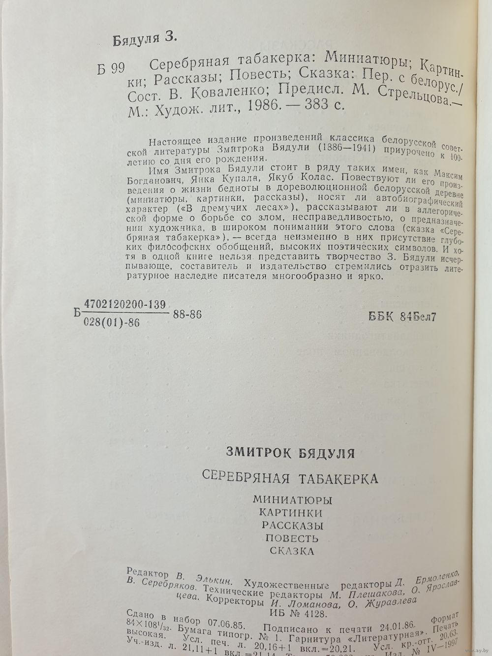 Имя Змитрока Бядули стоит в ряду таких имен, как Максим Богданович, Янка Купала, Якуб Колас. Повествуют ли его произведения о жизни бедноты в дореволюционной белорусской деревне (миниатюры, картинки, рассказы), носят ли автобиографический характер ("В дремучих лесах"), рассказывают ли в аллегорической форме о борьбе со злом, несправедливостью, о предназначении художника, в широком понимании этого слова (сказка "Серебряная табакерка"), - всегда неизменно в них присутствие глубоких философских обобщений, высоких поэтических символов. И хотя в одной книге нельзя представить творчество З.Бядули исчерпывающе, составитель и издательство стремились отразить литературное наследие писателя многообразно и ярко.