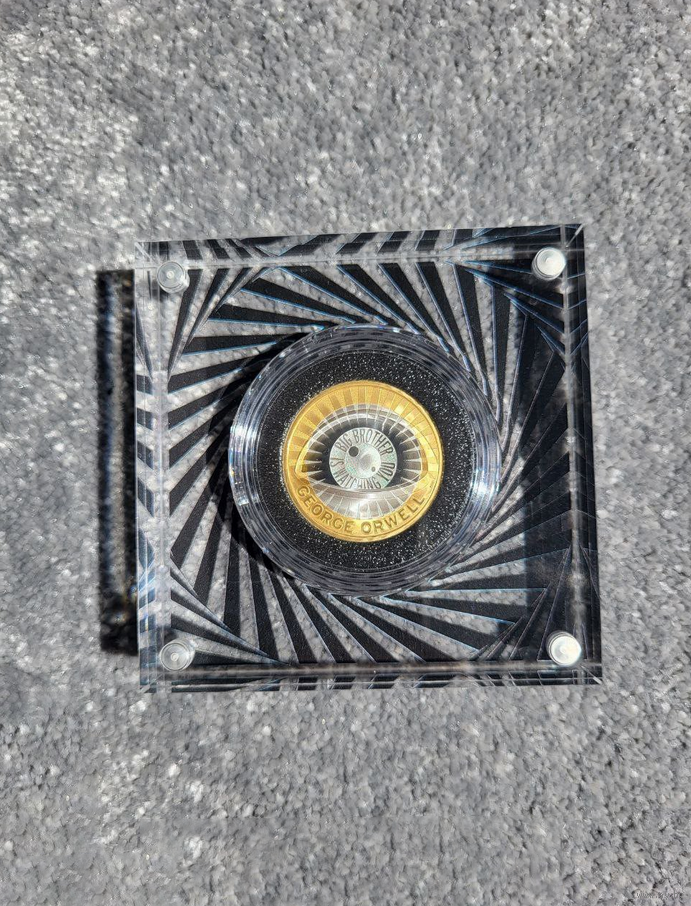 Монета отчеканена Королевским монетным двором Великобритании (The Royal Mint) в ограниченном тираже 4500 экземпляров, популярна среди нумизматов и поклонников романа 1984.