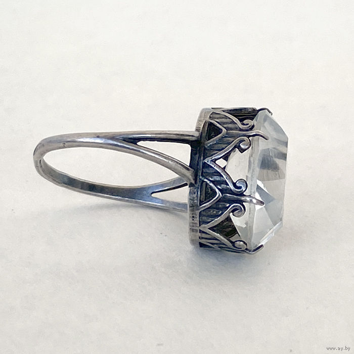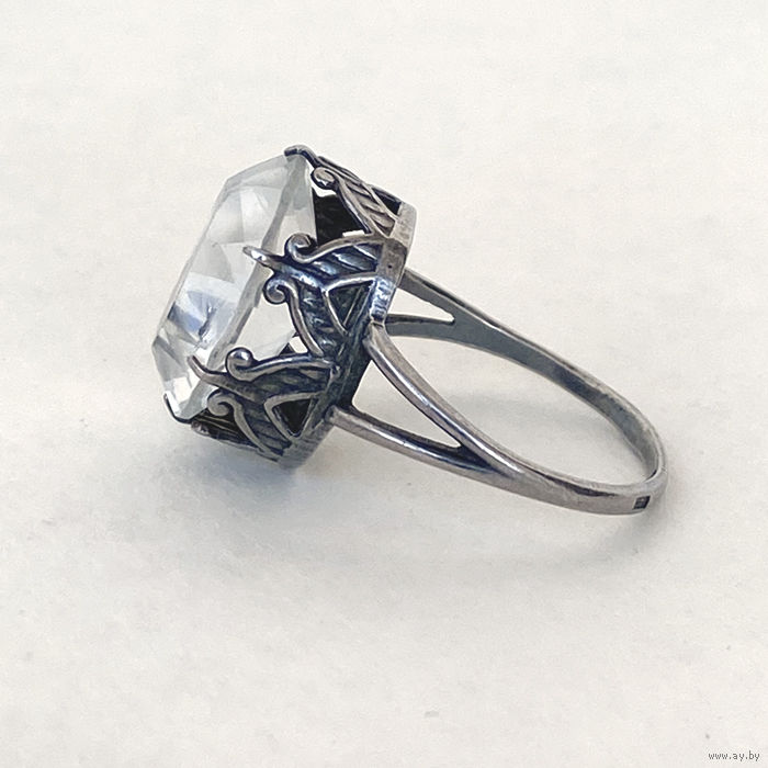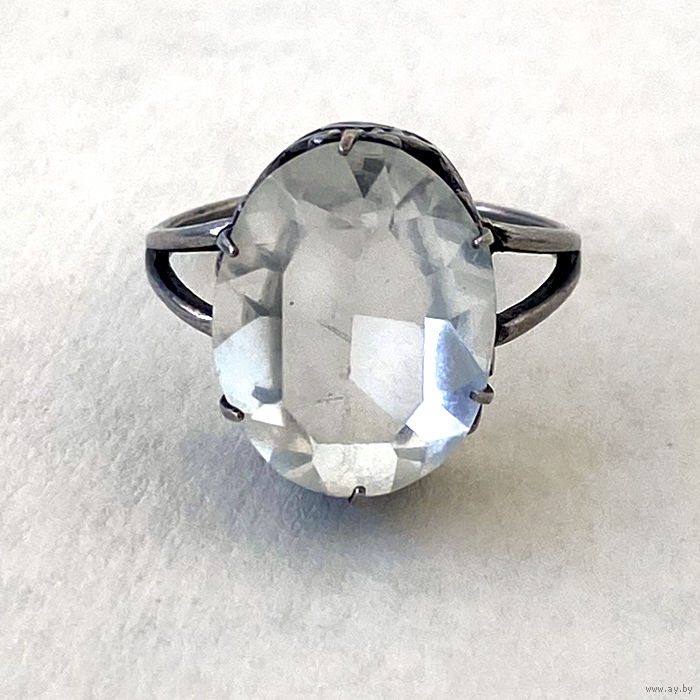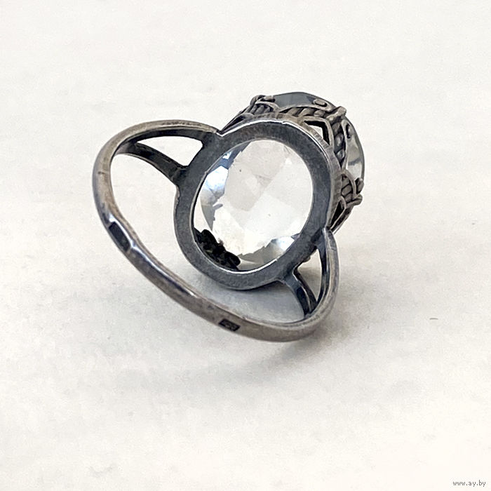 Кольцо серебряное винтажное 875 пробы, клеймо звезда СССР. Размер 18. Большой камень горный хрусталь, размер 17х13 мм