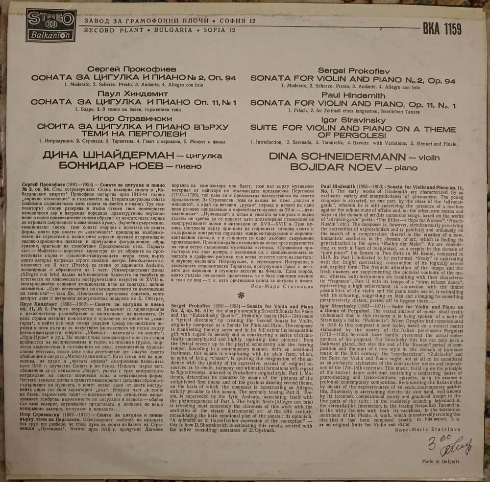 Sergei Prokofiev, Paul Hindemith, Igor Stravinsky, Dina Schneidermann, Bojidar Noev – Sonata For Violin And Piano No. 2, Op. 94 / Sonata For Violin And Piano, Op. 11. N. 1 / Suite For Violin And Piano On A Theme Of Pergolesi