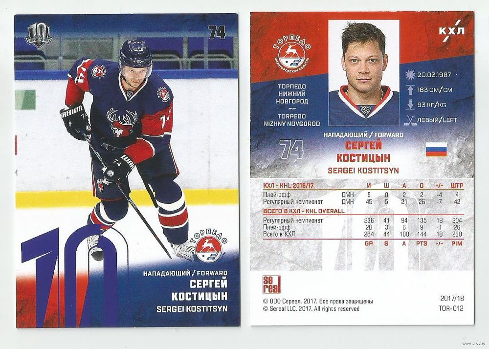 Сергей Костицын / "Торпедо" Нижний Новгород / Фиолетовая параллель / Коллекция "SeReal Карточки КХЛ 2017-2018".