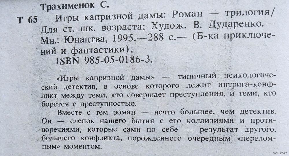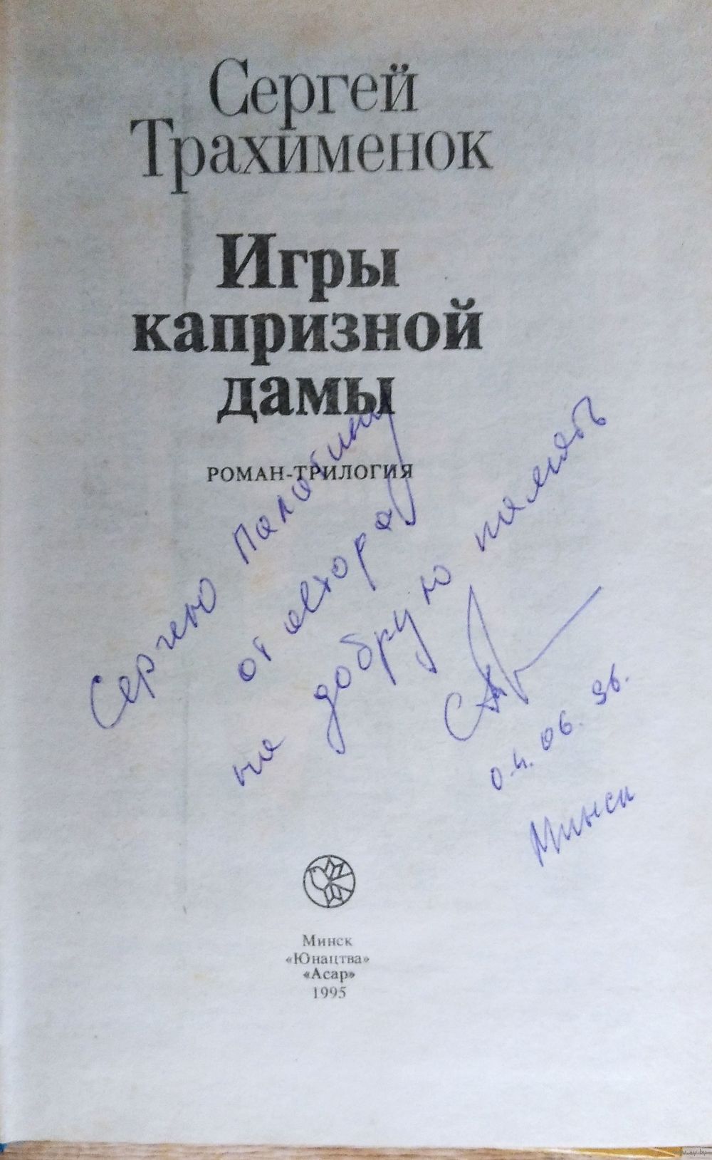 Сергей Трахименок. Игры капризной дамы. Серия: Библиотека приключений и фантастики. Автограф автора. Роман-трилогия: Для ст. шк. возраста. Мн. : Юнацтва : ПКИП "Асар", 1995 г.288 с. Твердый переплет.