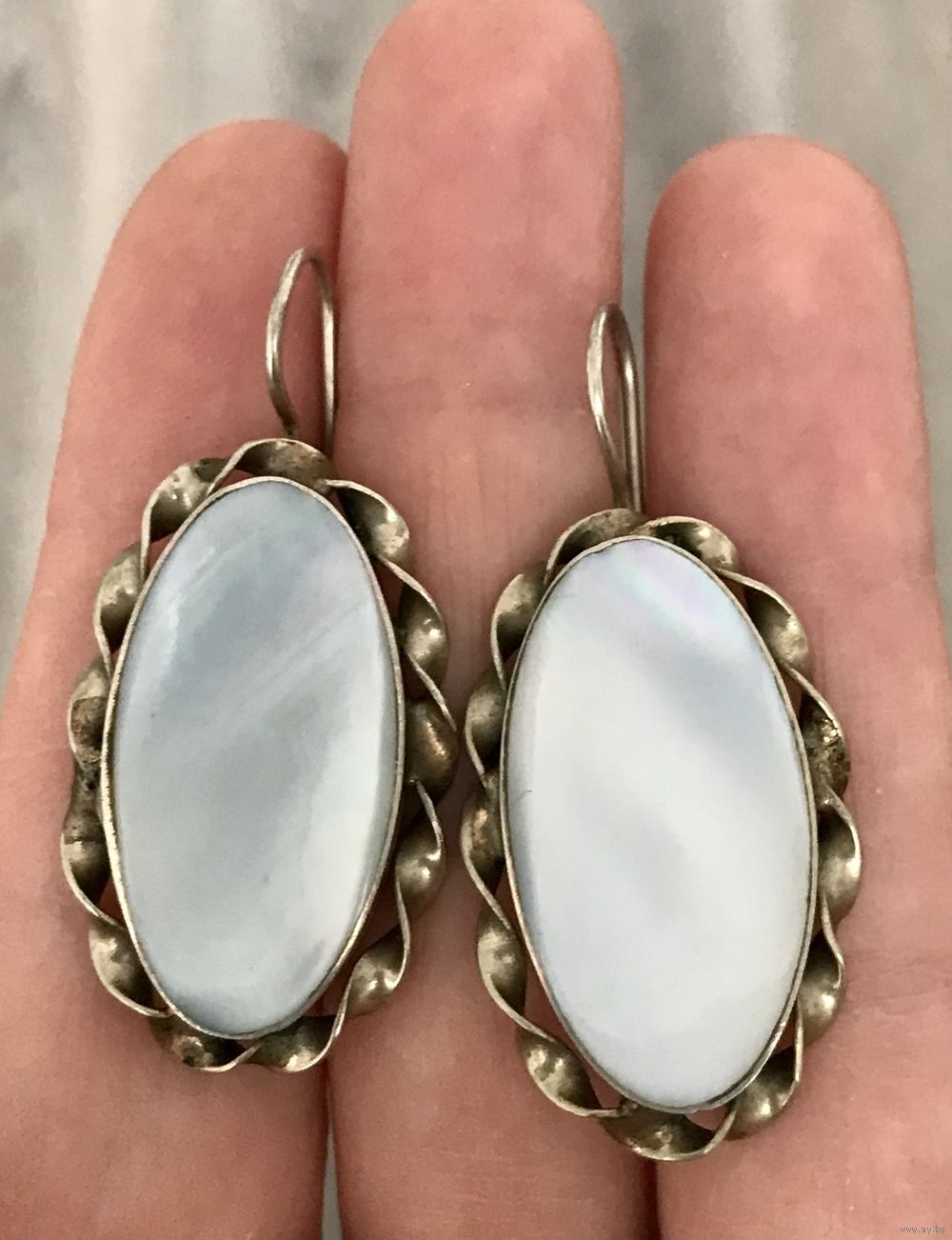 Крупные винтажные серьги из мельхиора и вставок из перламутра. Высота серьги с петлей 4,3см., размер вставки 3,7х1,5см. Состояние хорошее.