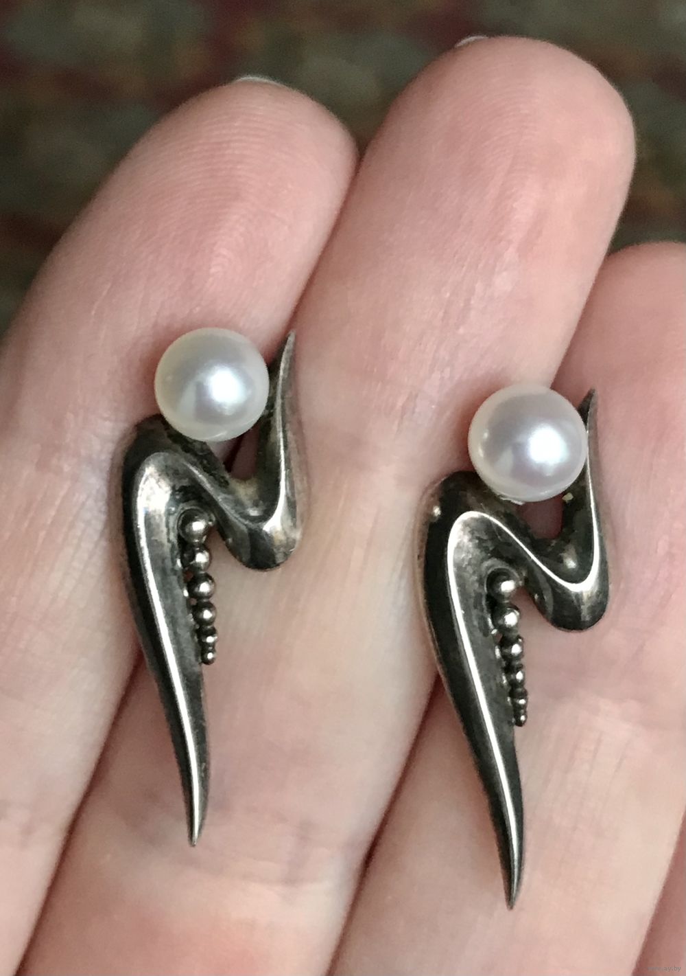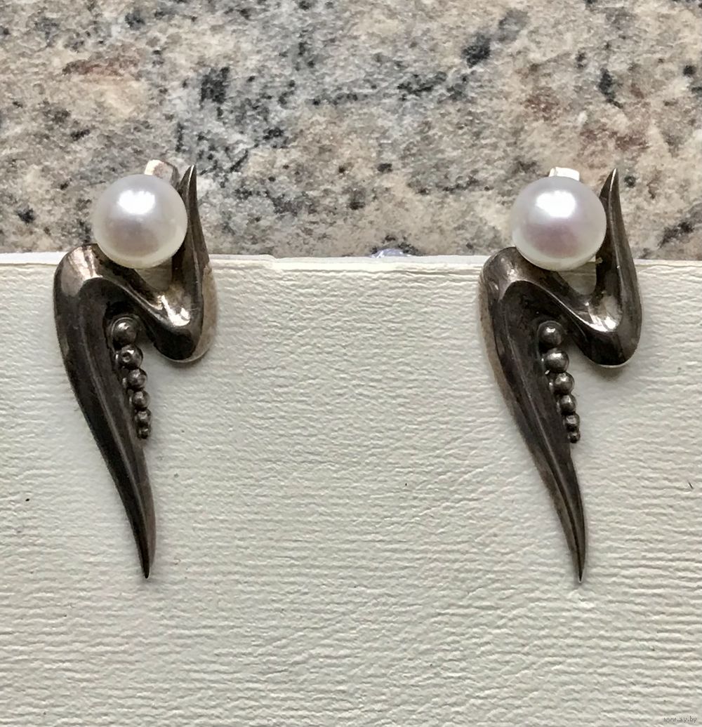 Серьги из серебра 925пр. (стоит пробирное клеймо Украины) и жемчужными вставками. Высота серьги 2,8см. Состояние хорошее.