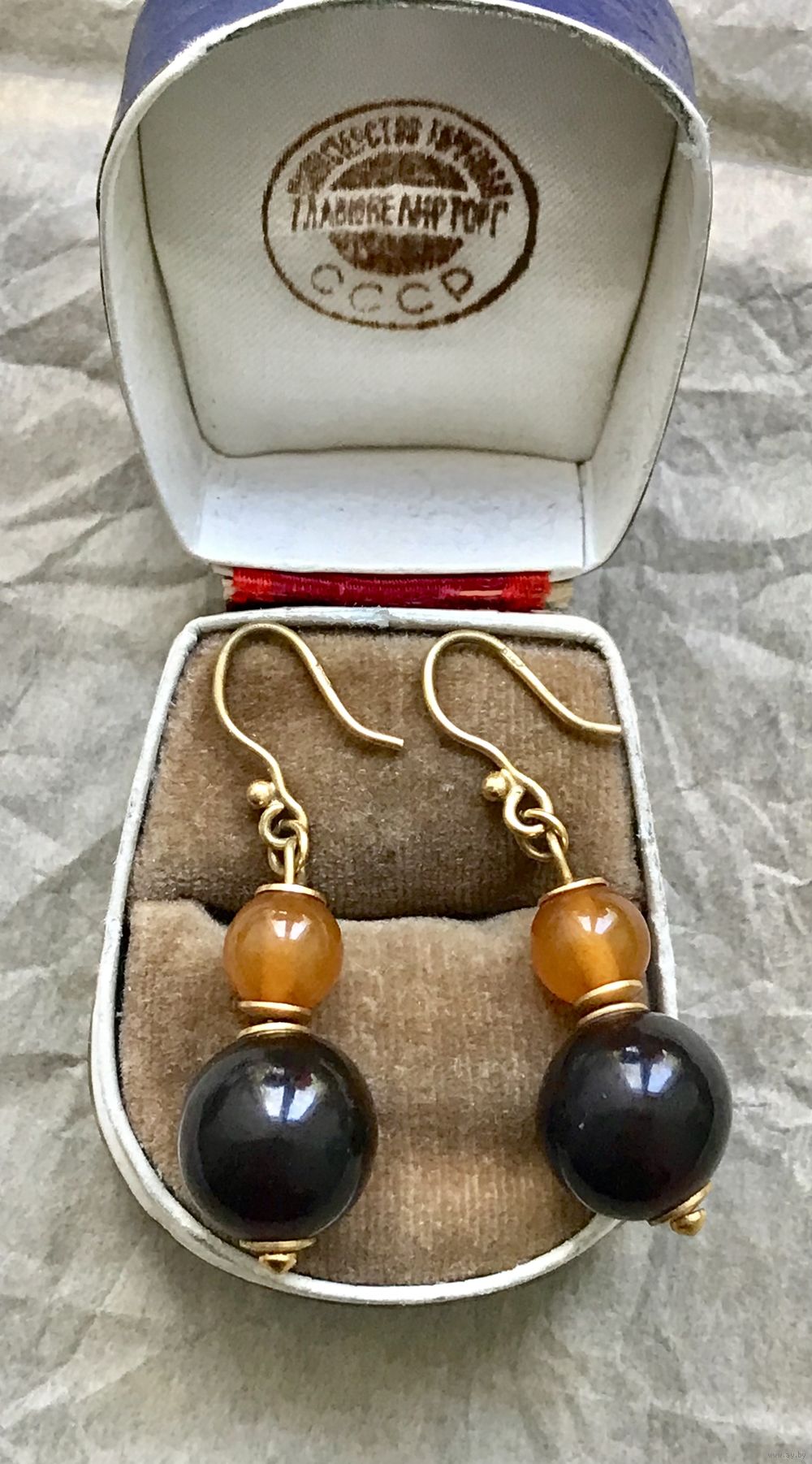 Серьги с основой из латуни и янтаря (пресс). Изготовлены в 1990г. в Калининграде (на крючках стоят отметки :0РЯ). Высота серьги 4,5см. Состояние хорошее.