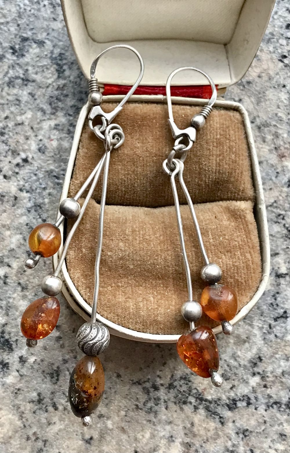 Серьги из серебра 925пр.(на каждой серьге стоит отметка 925 и пробирное клеймо с зубром) и янтаря. На одной серьге утеряна одна подвеска, можно носить как ассиметричные. Высота одной серьги 7см., другой 6,3см.