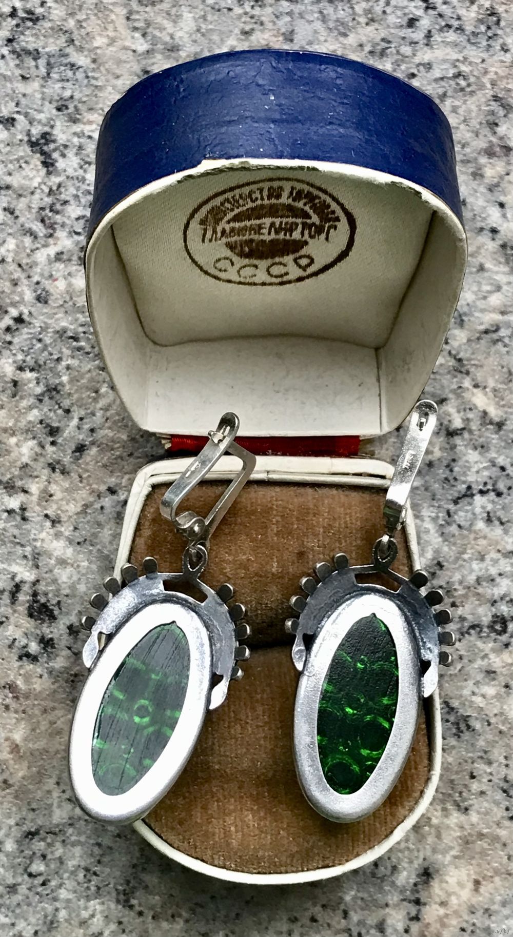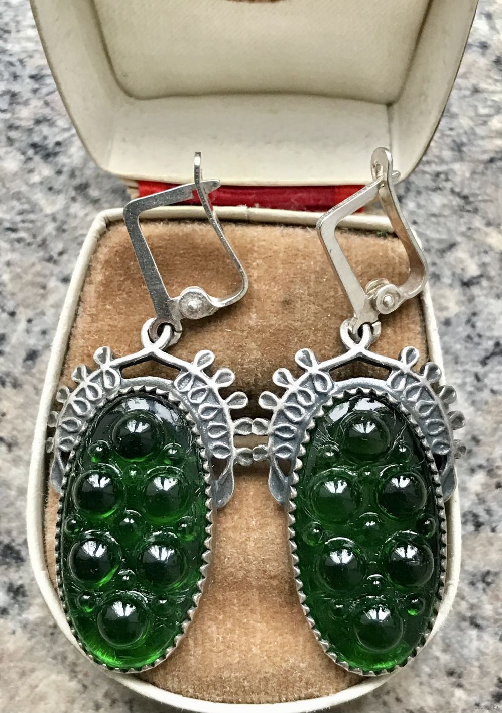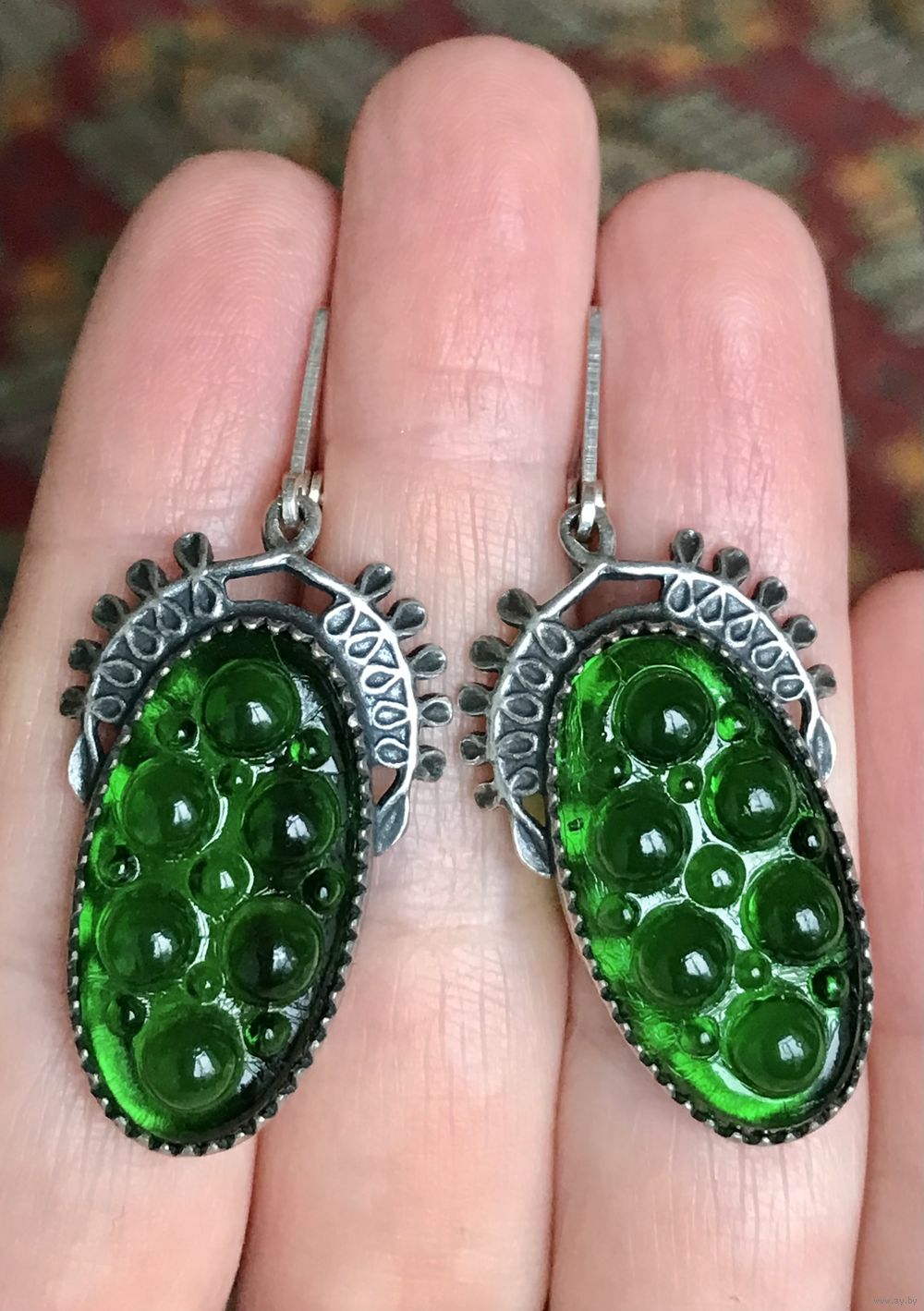 Винтажные крупные серьги с основой из мельхиора (клеймо) и вставками из цветного стекла. Высота серьги 4,5см, размер вставки 2,3х1,3см. Состояние хорошее.