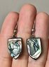 Небольшие серьги из сплава альпака, лицевая сторона украшена пластинами гелиотиса. Высота серьги с крючком 4,2см. На обратной стороне каждой серьги стоит отметка alpaca. Состояние хорошее.