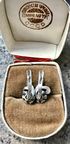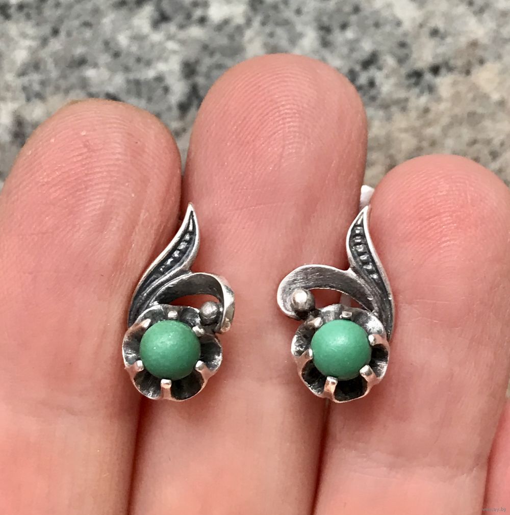 Серьги из серебра 875пр. со вставками из бирюзы. Сделаны в 1987г. в Москве (именник .7МЮ). Высота серьги 1,6см., вес пары 3,67гр. Состояние хорошее.