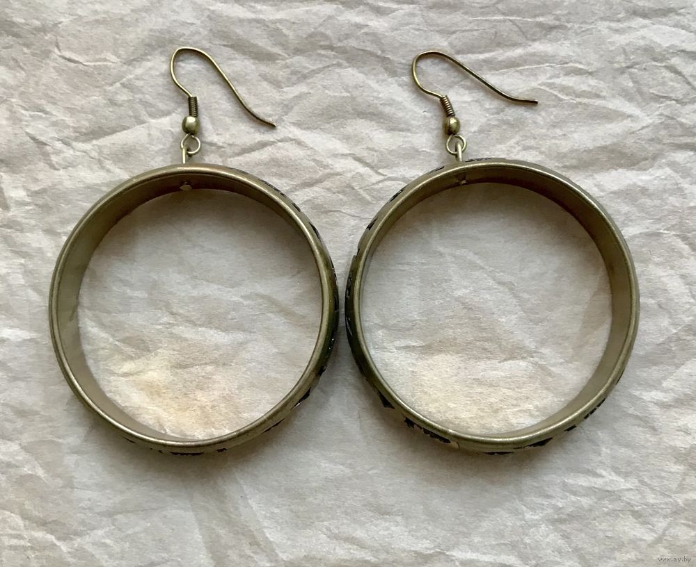 Крупные винтажные серьги из латуни. Высота с петлей 6см., диаметр кольца 4см., ширина 0,9см. Состояние хорошее.