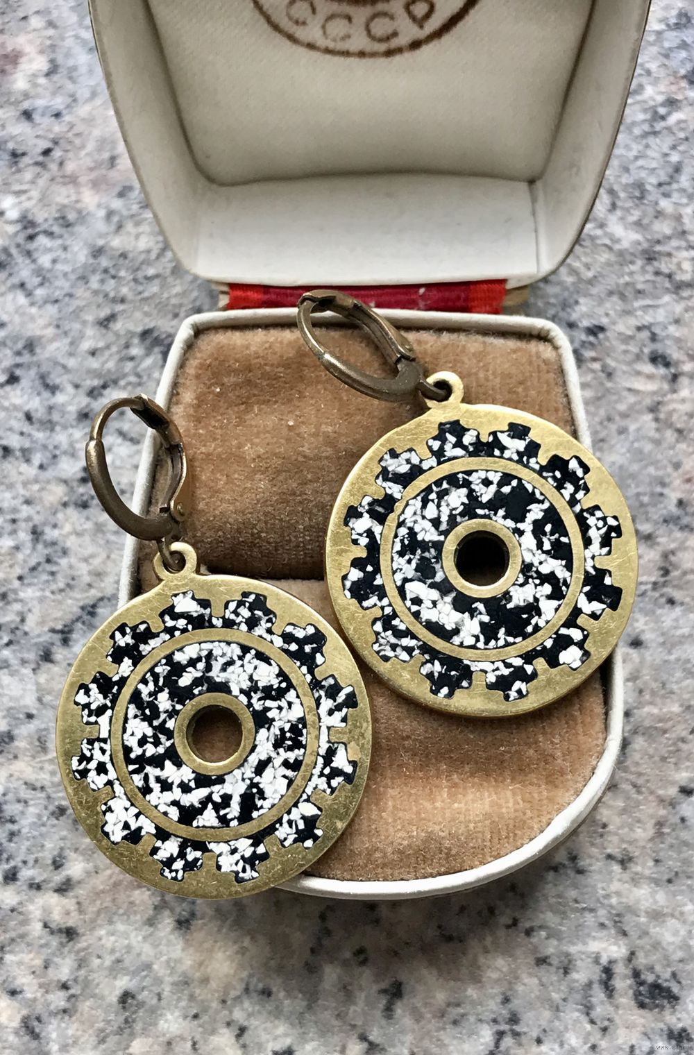 Крупные серьги с основой из латуни, лицевая сторона украшена эмалью. Высота серьги 4см., диаметр подвески 2,5см. Состояние хорошее.