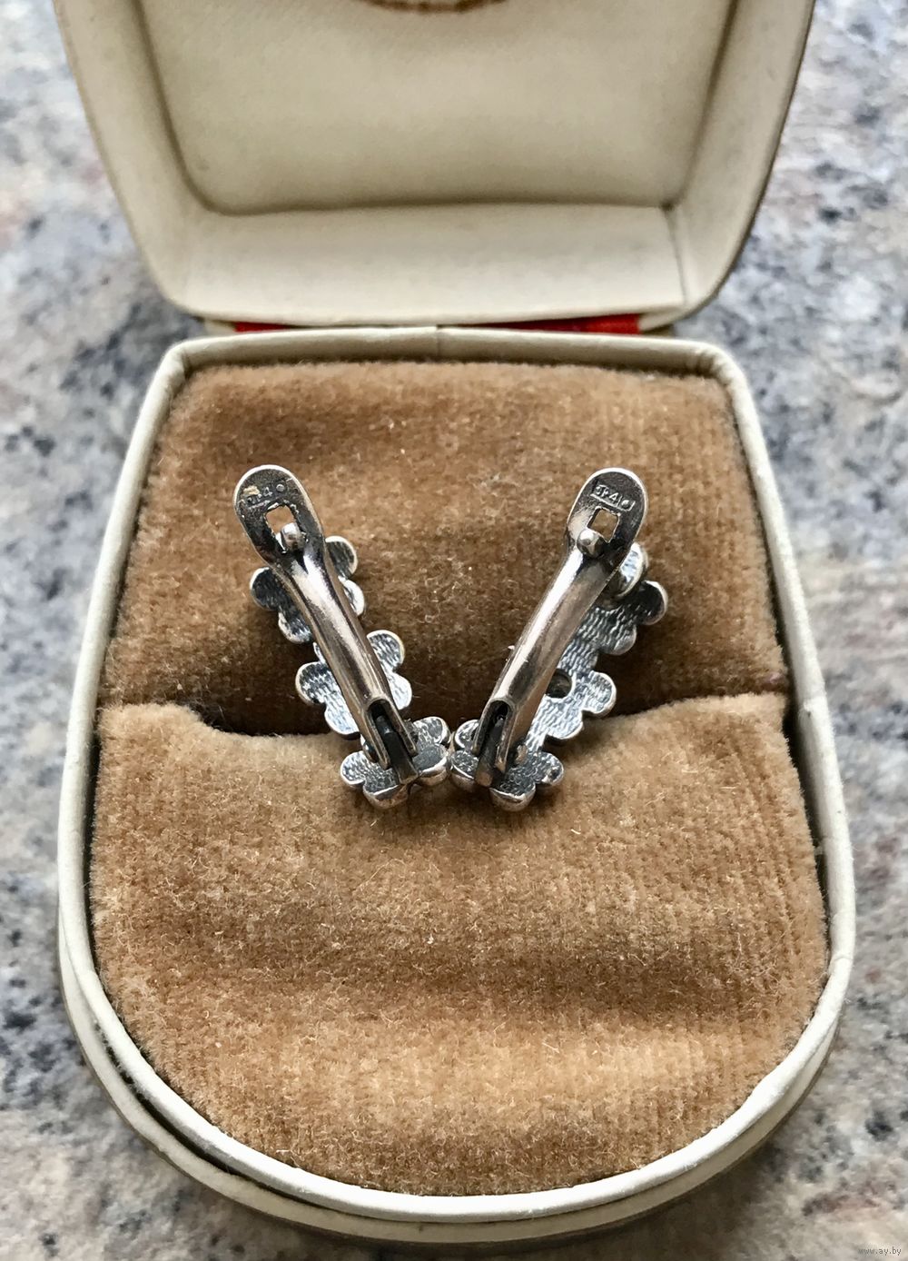 Серьги из металла с серебрением (стоит клеймо), вставка стекло, высота серьги 1,5см. Состояние хорошее.