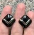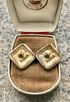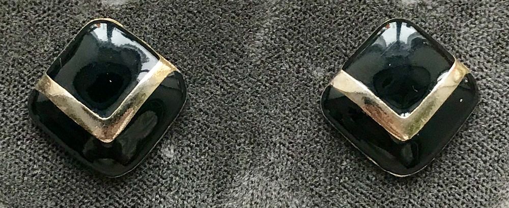 Винтажные серьги-пусеты бренда Faberge с основой из металла золотистого тона, лицевая сторона украшена эмалью чёрного цвета. На обратной стороне имеются незначительные потёртости позолоты. Размер серьги 1,6х1,6см. Маркированы (стоит надпись Faberge и знак копирайта).