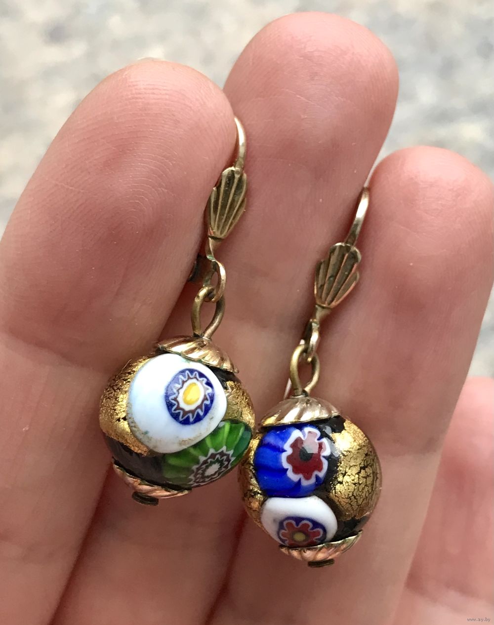 Серьги с подвесками из худ.стекла. Высота серьги 3,3см., подвески-шарики немного отличаются по размеру, один шарик диаметром 1,2см., другой 1см. В носке не заметно. Состояние хорошее.