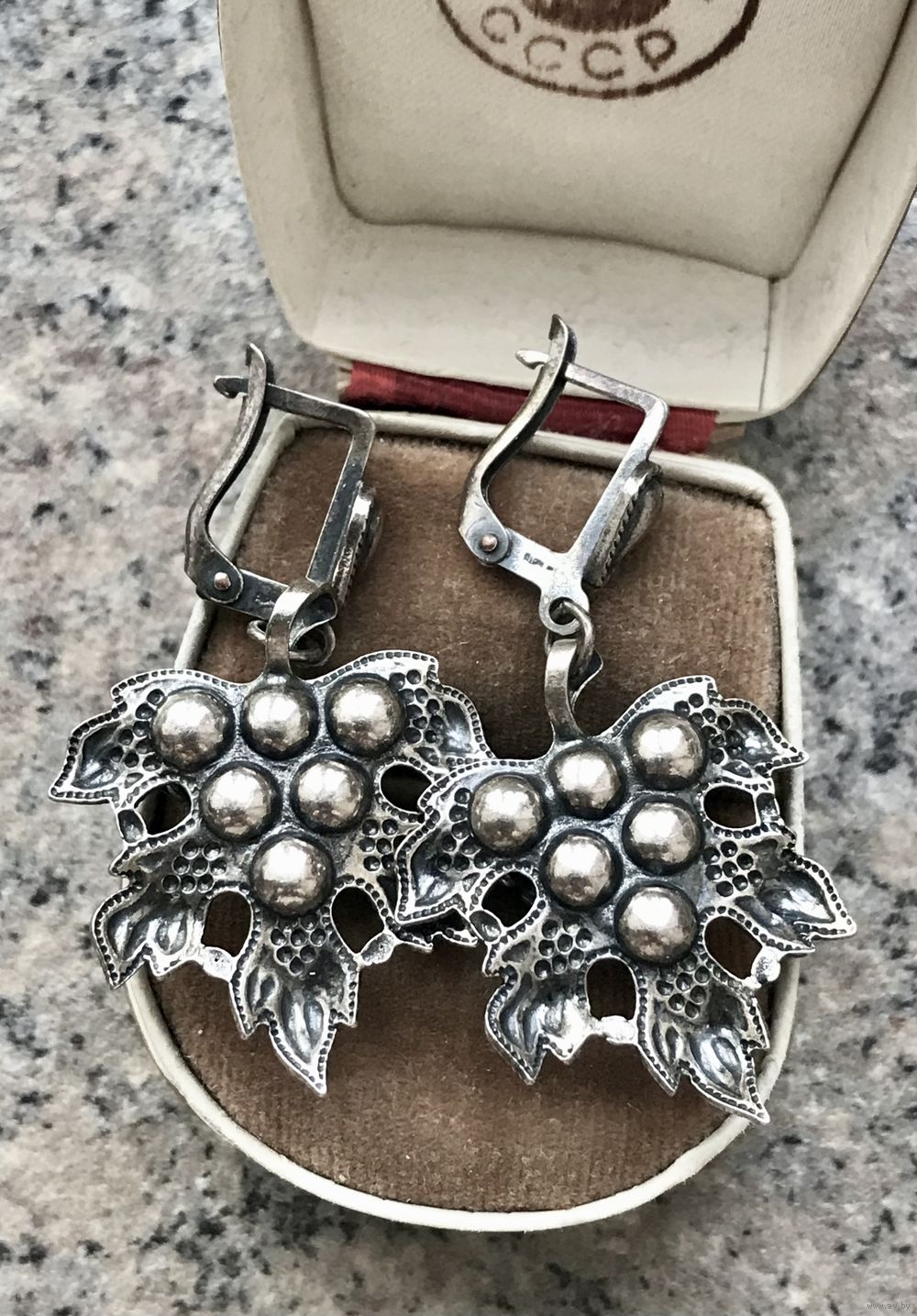 Крупные серьги из мельхиора с серебрением со вставками из цветного стекла. Высота серьги 4,5см., размер подвески 3х2,7см. Состояние хорошее.