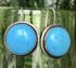 Крупные серьги с основой из металла с серебрением (была произведена замена застежки с английской на петлю) и вставок под бирюзу. Высота серьги 4см., диаметр подвески 2,3см., диаметр вставки 1,7см. Состояние хорошее.