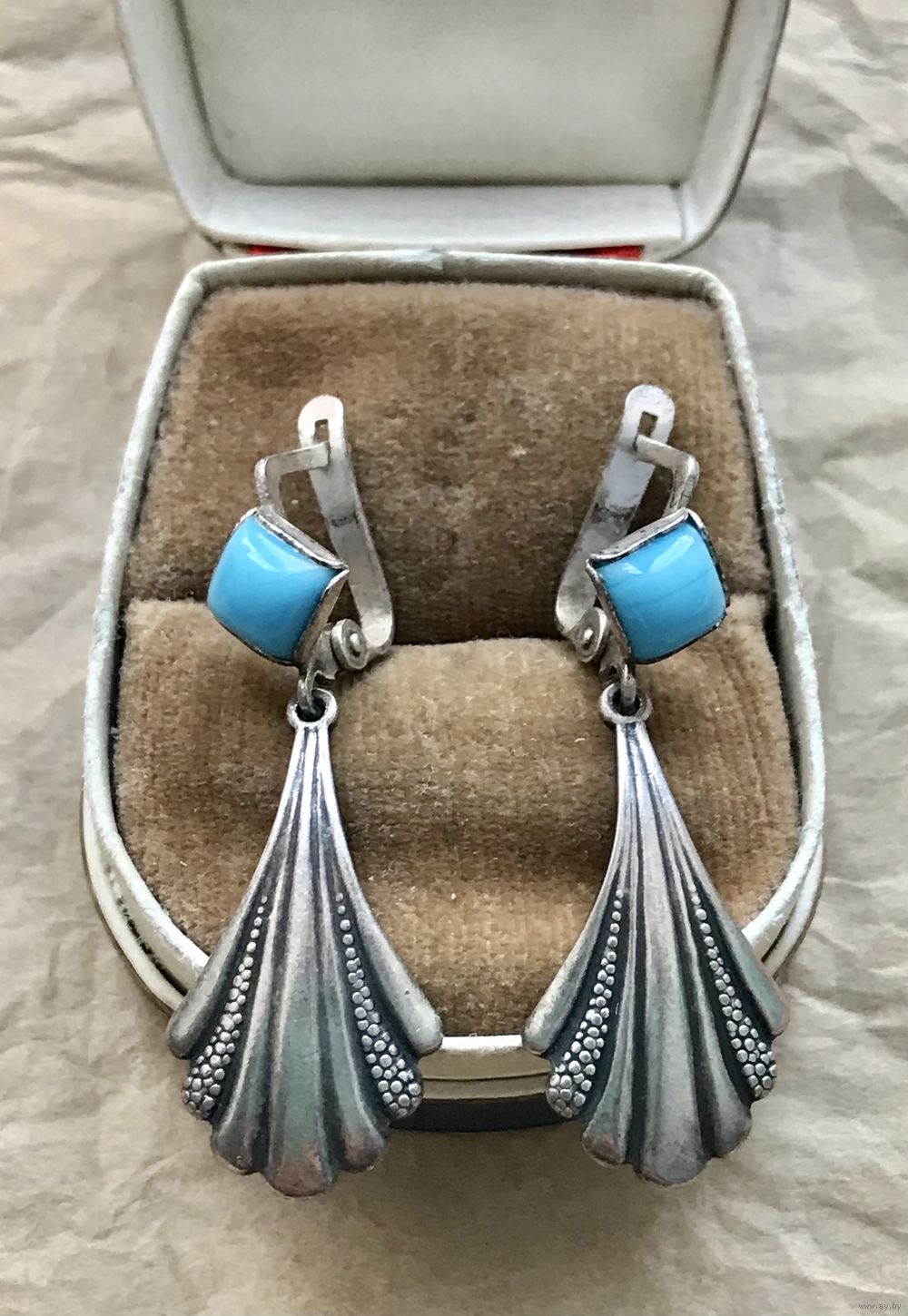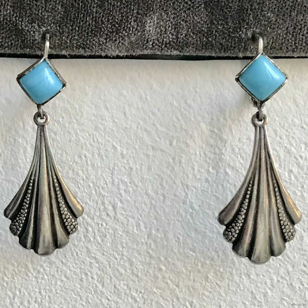 Винтажные серьги из мельхиора, вставки из смальты под бирюзу. Высота серьги 4см., размер вставки 1,4х1,4см. Состояние хорошее.
