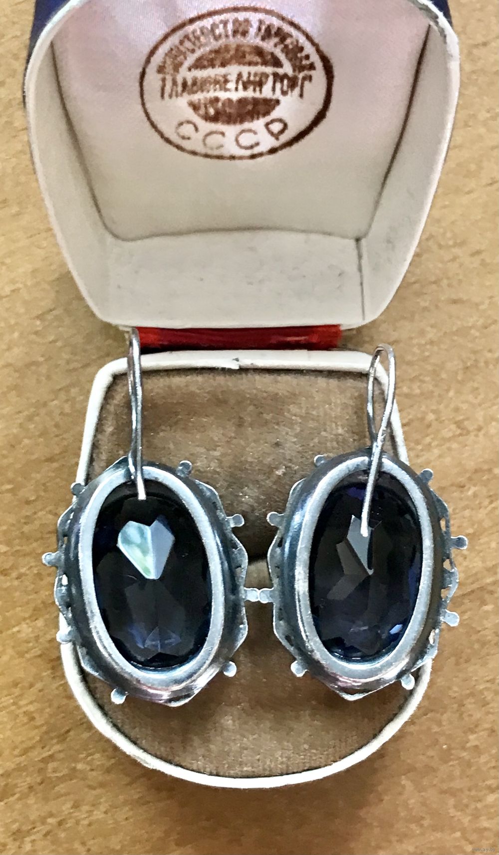 Крупные серьги от завода «Красная Пресня», СССР 90-е гг. Сделаны из мельхиора с серебрением, вставки из ювелирного стекла. На одной вставке незначительный скольчик. Высота серьги 4см., размер вставки 1,8х1,3см.
