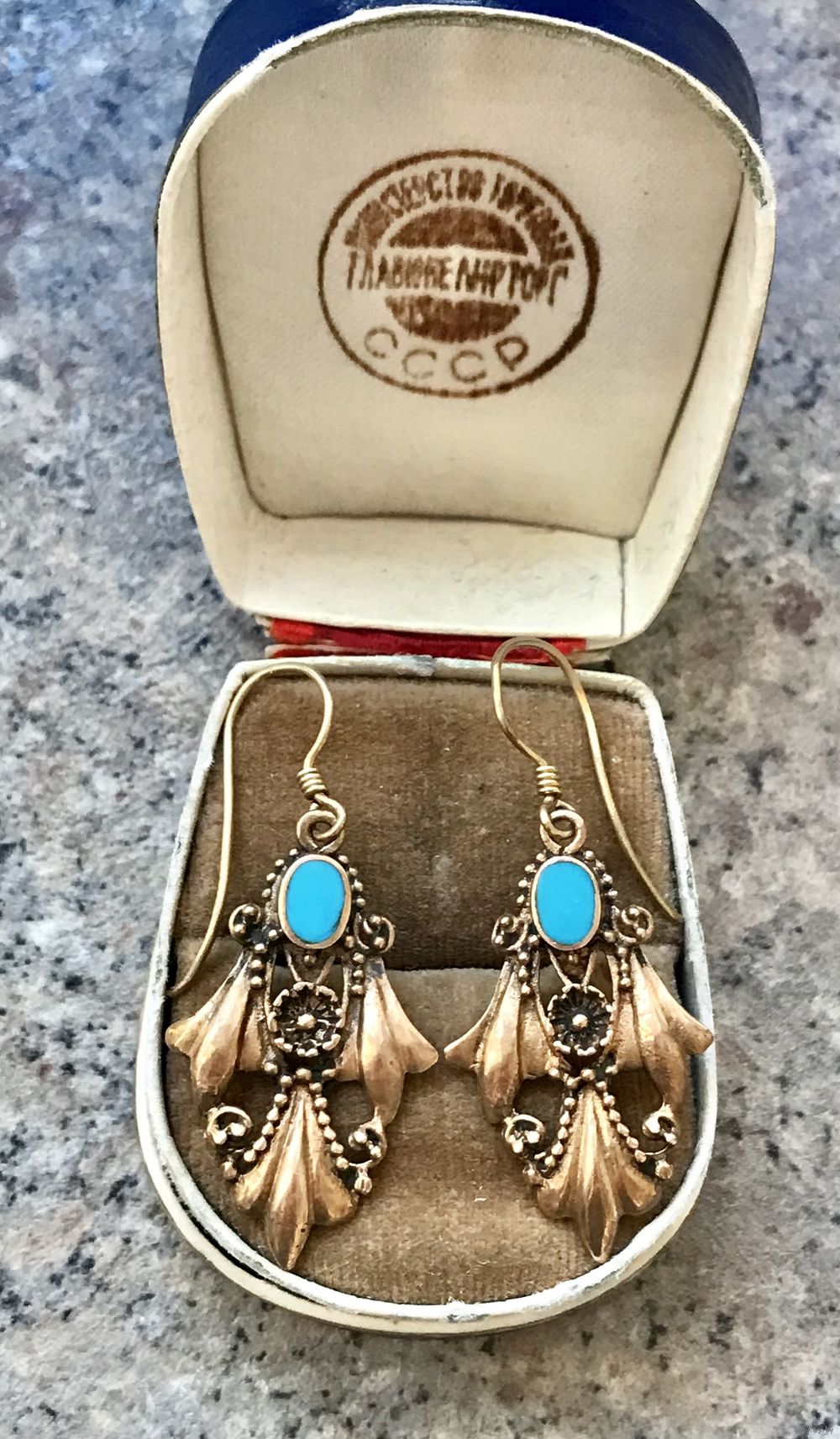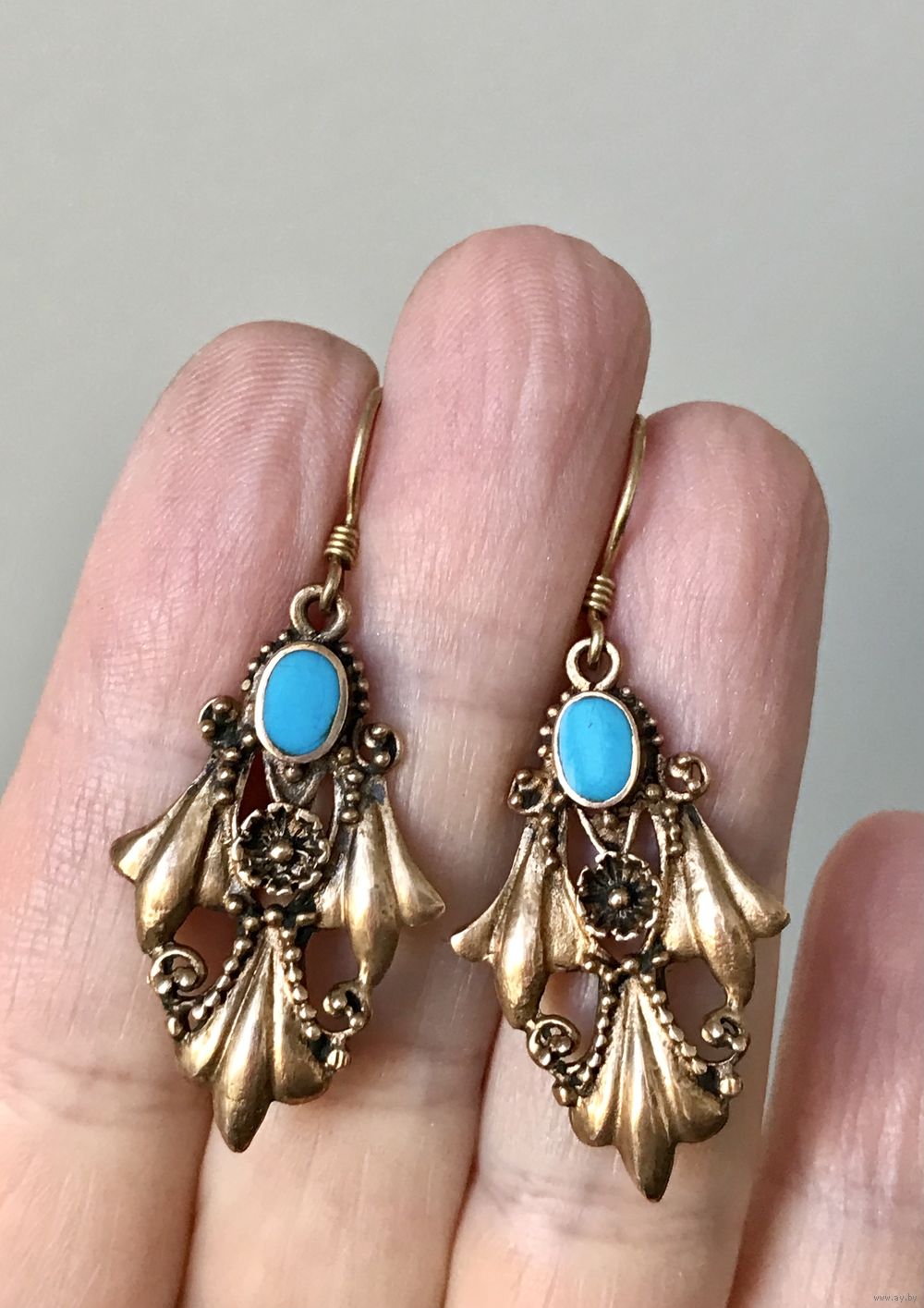 Винтажные серьги из серебра 925пр. с позолотой. Вставка голубого цвета похожа на бирюзу, но может быть и смальта. Высота серьги 4,5см., вес пары 4,55гр. Состояние хорошее.