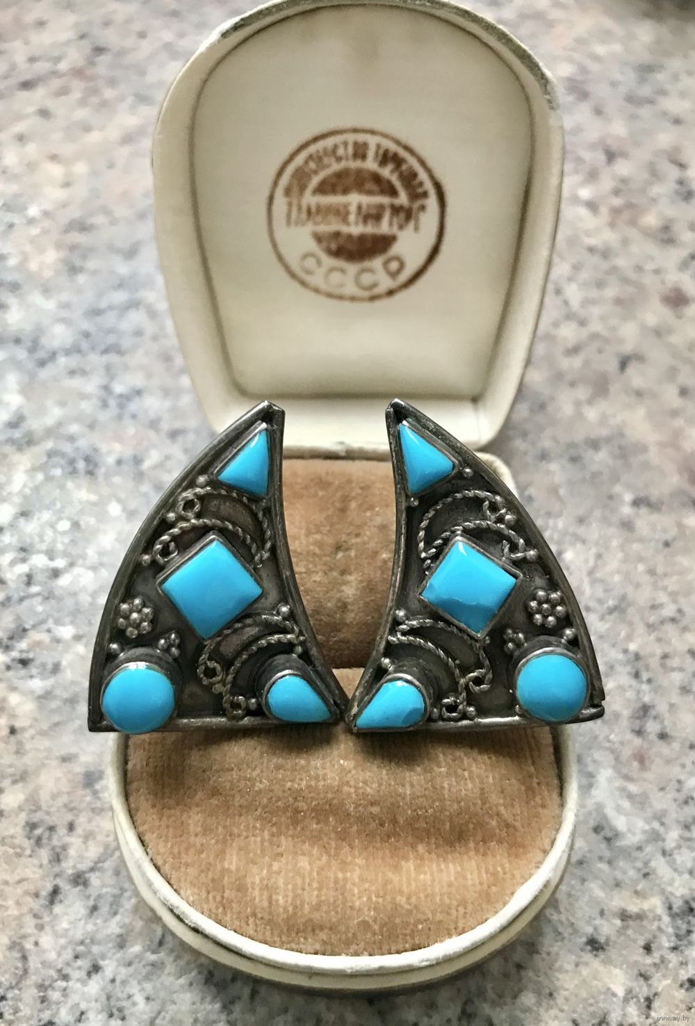 Крупные эффектные серьги из серебра (на каждой серьге стоит отметка) и вставками из смальты под бирюзу (на одной серьги имеются сколы). Серьги имеют скорее всего египетское происхождение. Размер серьги 3х2,2см. Вес 14,13гр.